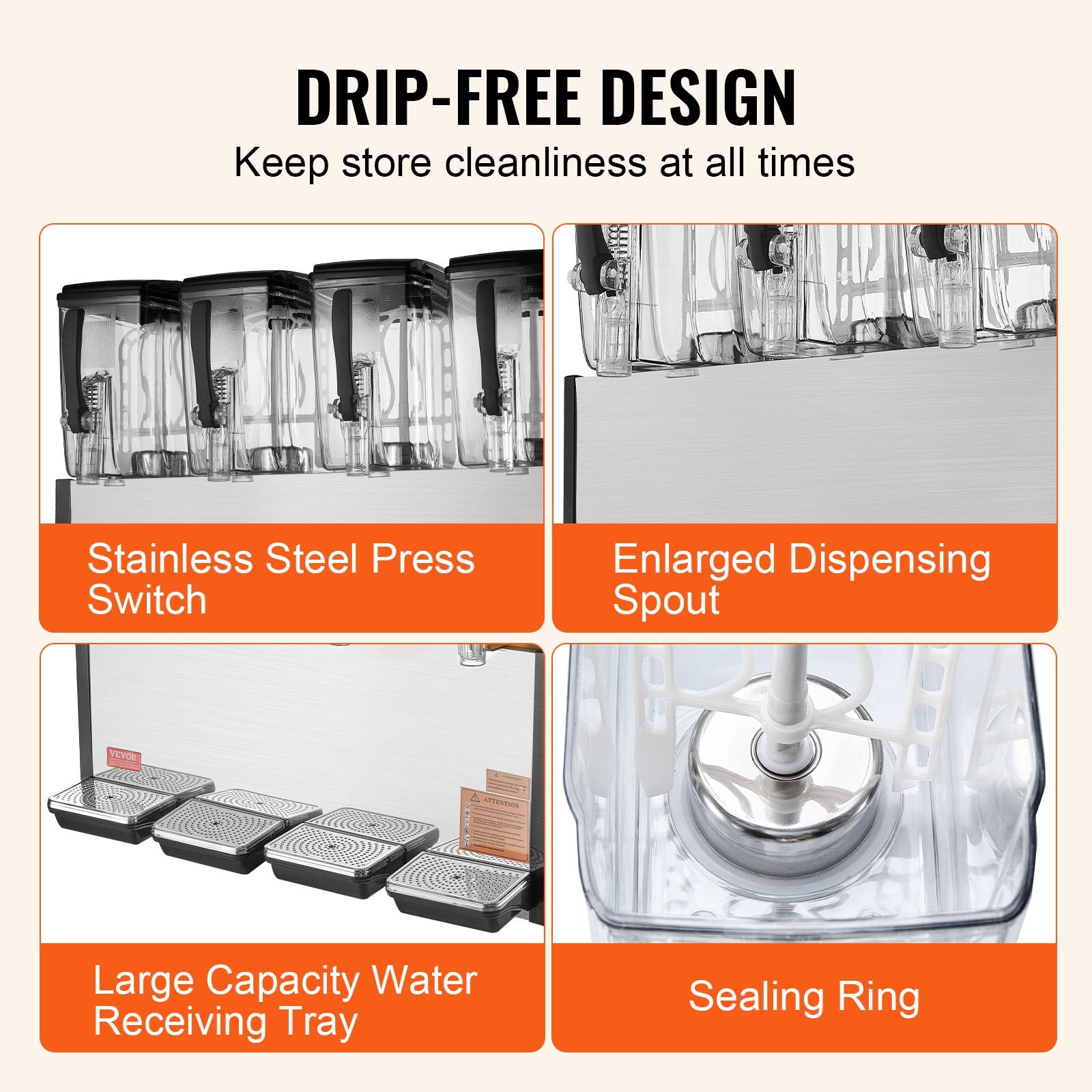 - Großes Fassungsvermögen: Dieser gewerbliche Getränkespender verfügt über einen 12-Liter-Tank und bietet somit Platz für große Getränkemengen. Der verbesserte Auslauf mit großem Durchmesser ermöglicht das einfache und problemlose Ausschenken von Getränken mit kleinen Partikeln wie Kokosnusssaft und Fruchtfleisch. Ein Dichtungsring aus Gummi verhindert das Auslaufen von Getränken.