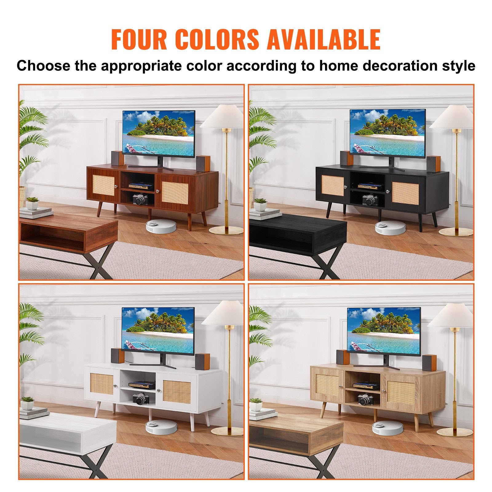 TV-Ständer aus Rattan, Boho-TV-Schrank für 55-Zoll-Fernseher, TV-Ständer im Mid-Century-Modern-Stil, TV-Konsole aus Rattan mit verstellbaren Regalböden für Wohnzimmer und Medienraum, Walnuss