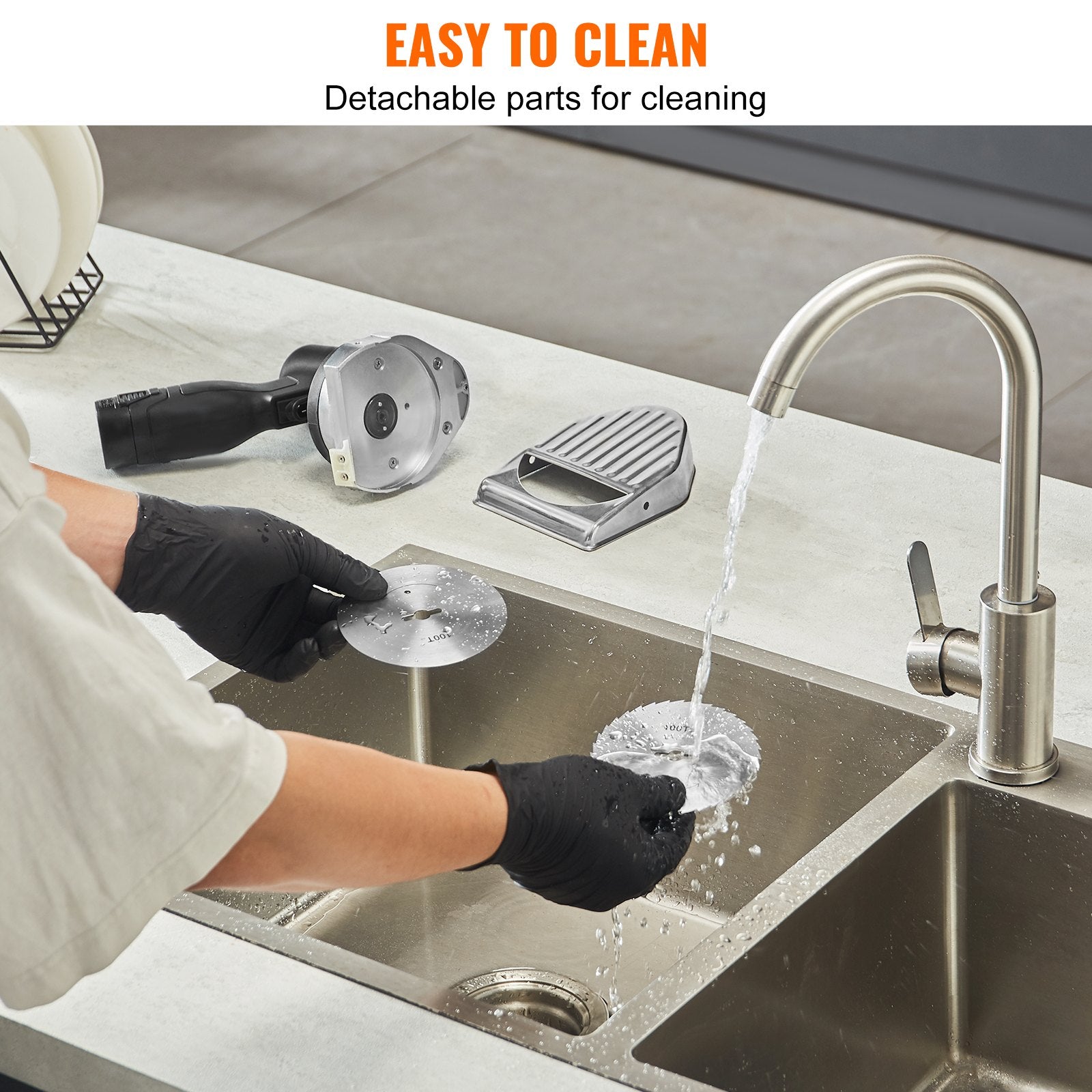 - Abnehmbar: Die Teile, die mit Lebensmitteln in Berührung kommen, bestehen aus lebensmittelechtem 5Cr15MoV-Edelstahl, der für seine Verschleiß- und Korrosionsbeständigkeit bekannt ist. Klingen und Zubehör sind zur einfachen Reinigung abnehmbar.