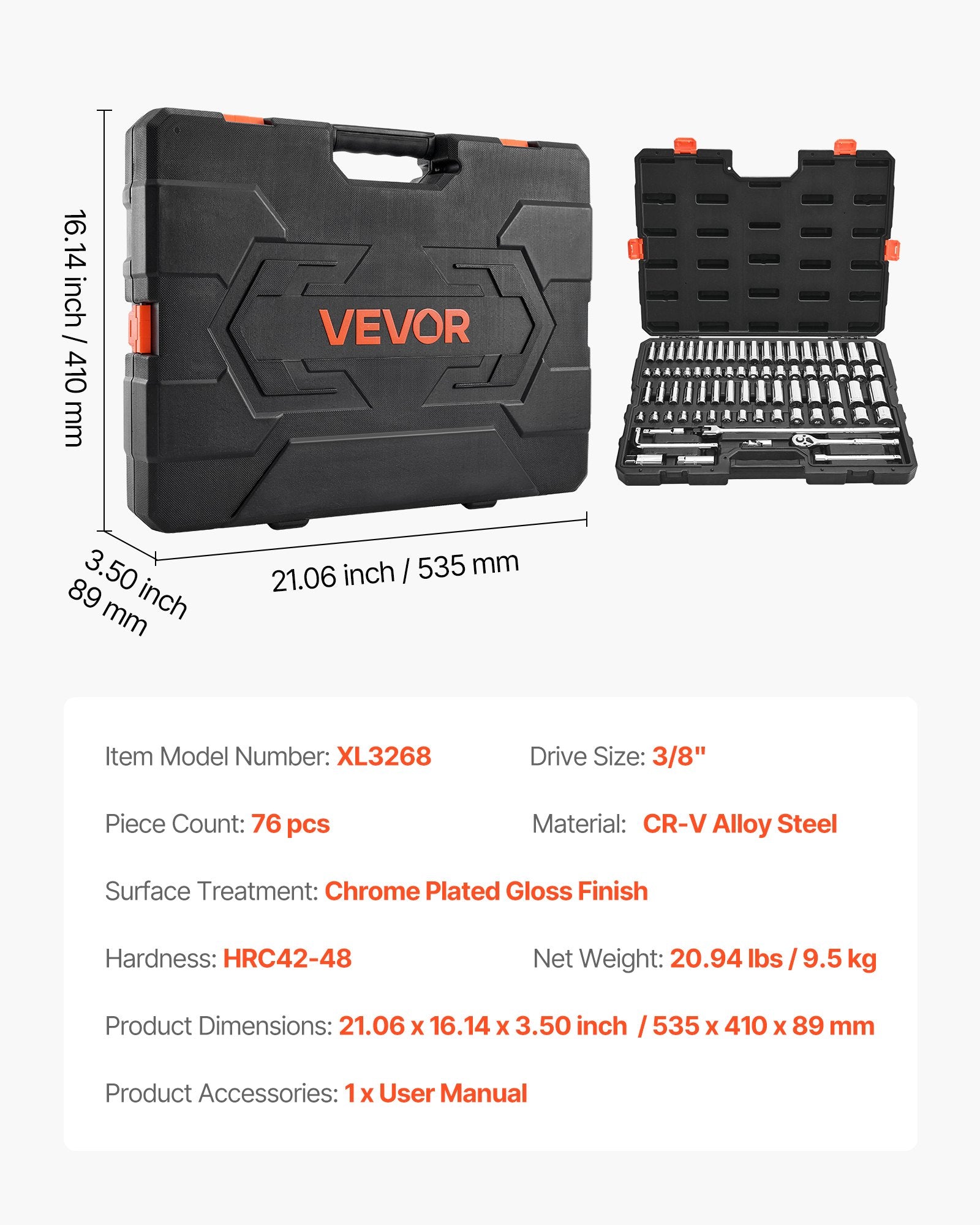 Steckschlüsselsatz, 76-teilig, 9,5-mm-Antrieb, Steckschlüssel- und Ratschenset, SAE und metrisch, tief und flach, Mechaniker-Werkzeugset mit Zubehör und Aufbewahrungskoffer, CR-V-Legierungsstahl, für Kfz-Reparaturen