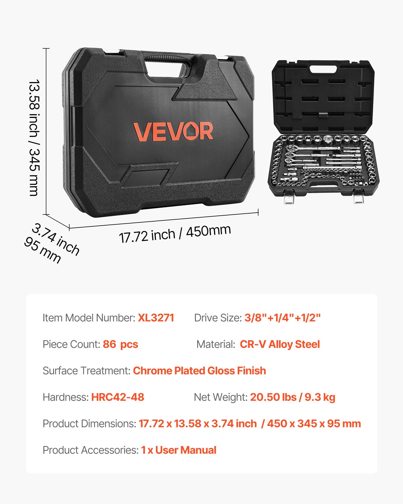 Steckschlüsselsatz, 86-teilig, 9,5, 6,4 und 12,7 mm Antriebs-Steckschlüssel und Ratschenset, SAE und metrisch, Mechaniker-Werkzeugset mit Ratschenschlüssel, Zubehör und Aufbewahrungskoffer, CR-V-Legierungsstahl, für die Autoreparatur