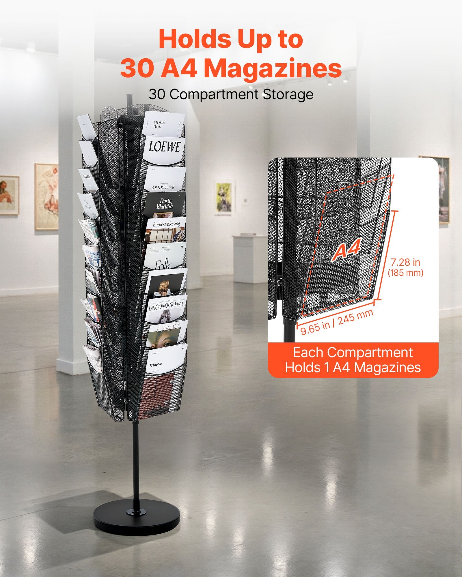 Drehbarer Prospektständer, Zeitschriftenständer mit 30 Fächern aus Netzgewebe, tragbarer, freistehender Zeitschriftenständer, Zeitungs- und Kataloghalter aus Metall für Ladenausstellungen, Büros und Messen
