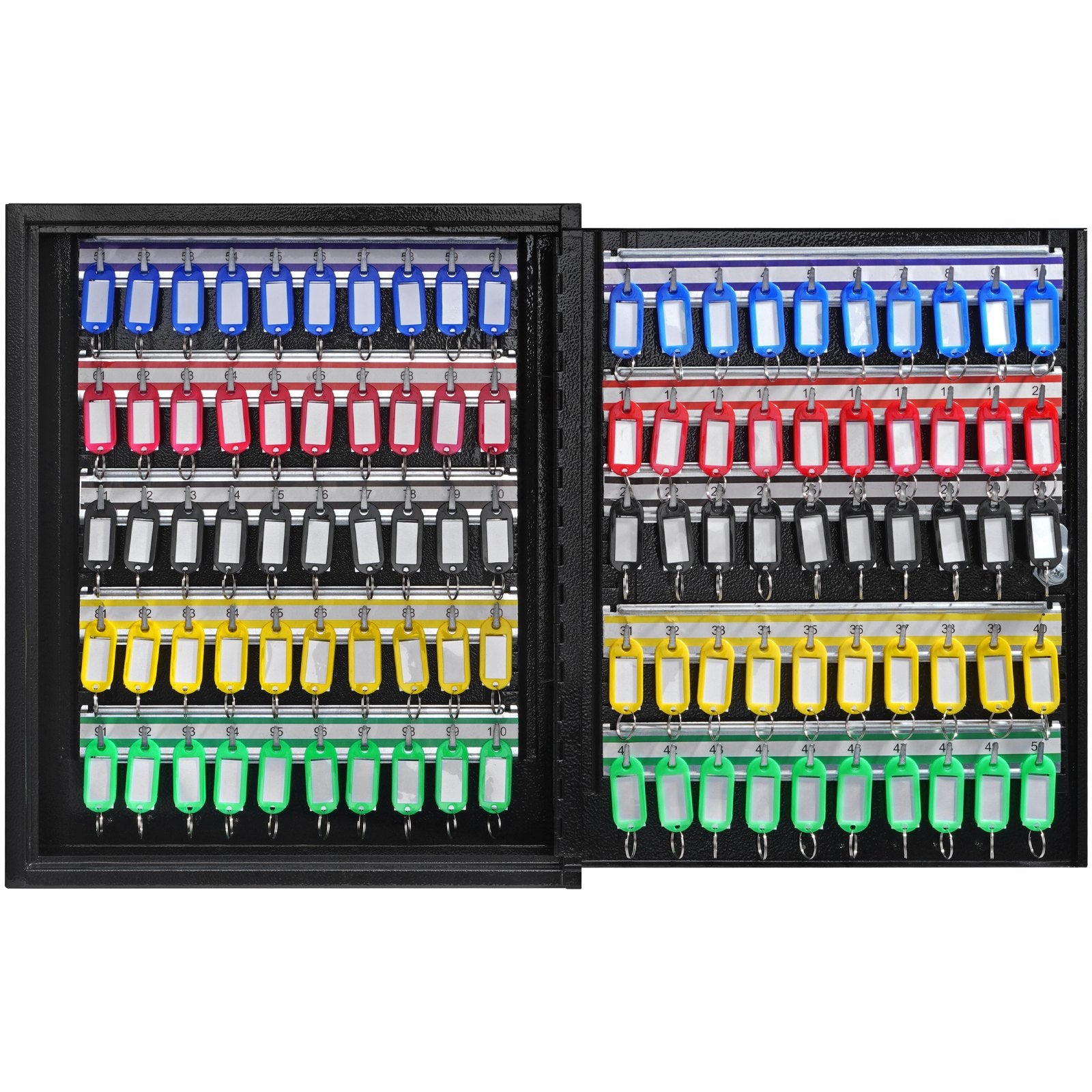 Schlüsselschrank für 100 Schlüssel, Schlüsseltresor mit verstellbaren Halterungen, Sicherheits-Schlüsselaufbewahrungsbox aus Stahl, Schlüsselorganizer mit 100 farbigen Schlüsselanhängern und 2 Karteikarten für Schule, Büro und Hotel