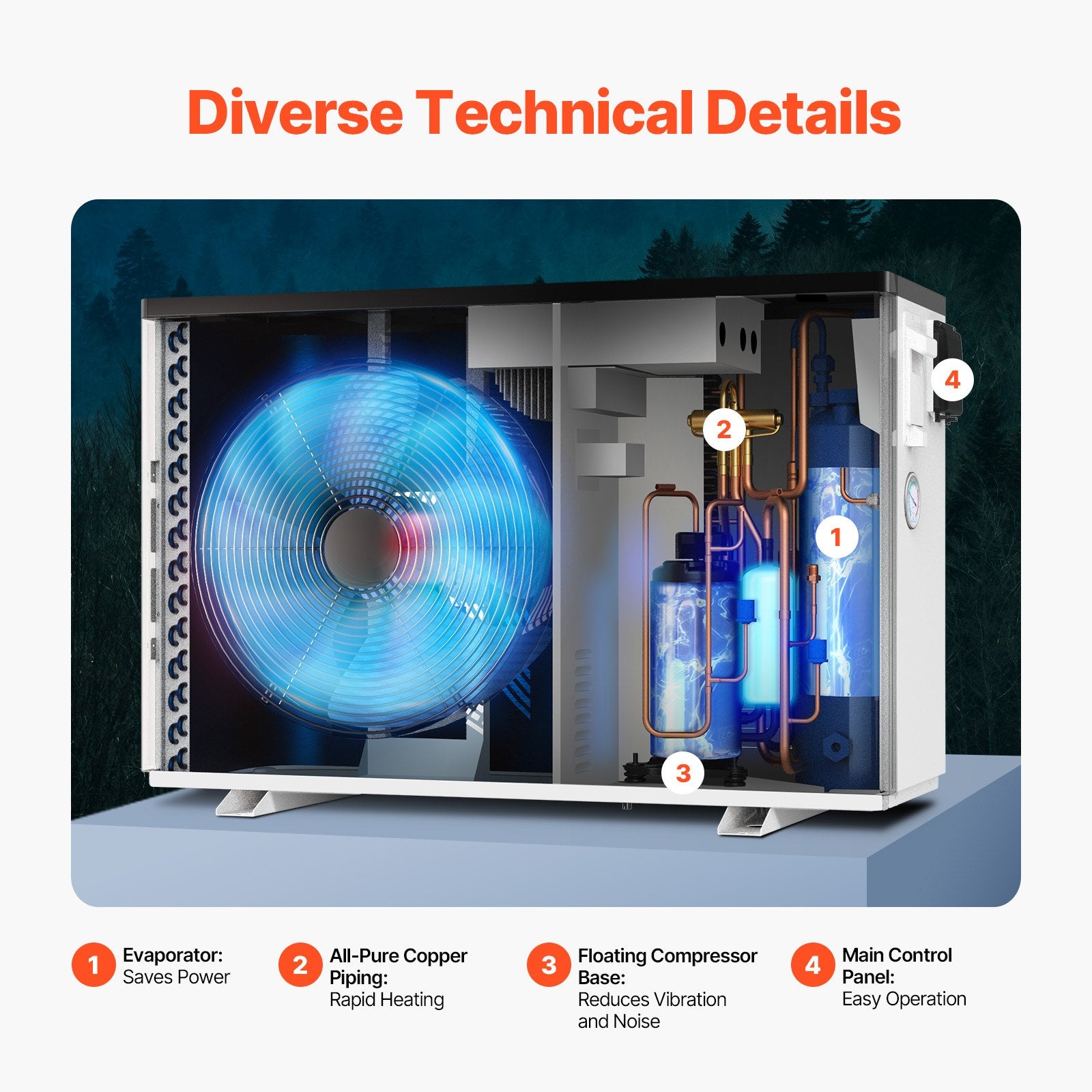 - Langlebige Robustheit: Dank eines Hochleistungskompressors und eines Wärmetauschers aus Titanrohren ist diese Pool-Wärmepumpe beständig gegen Salz, Chlor und Korrosion. Dies gewährleistet eine stabile Leistung und lange Lebensdauer bei minimalem Wartungs- und Austauschaufwand.
