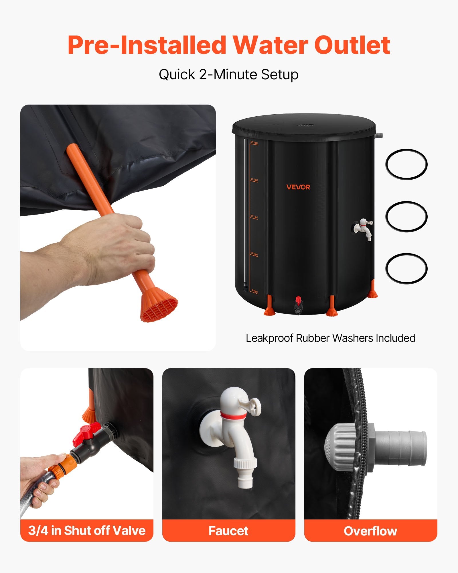 Zusammenklappbare Regentonne, 201 l, tragbare Regenwassersammeltonne, 1000D PVC-Regenwassersammelsystem, Garten-Wasserauffangbehälter mit Wasserhahn und Überlaufset, Schwarz