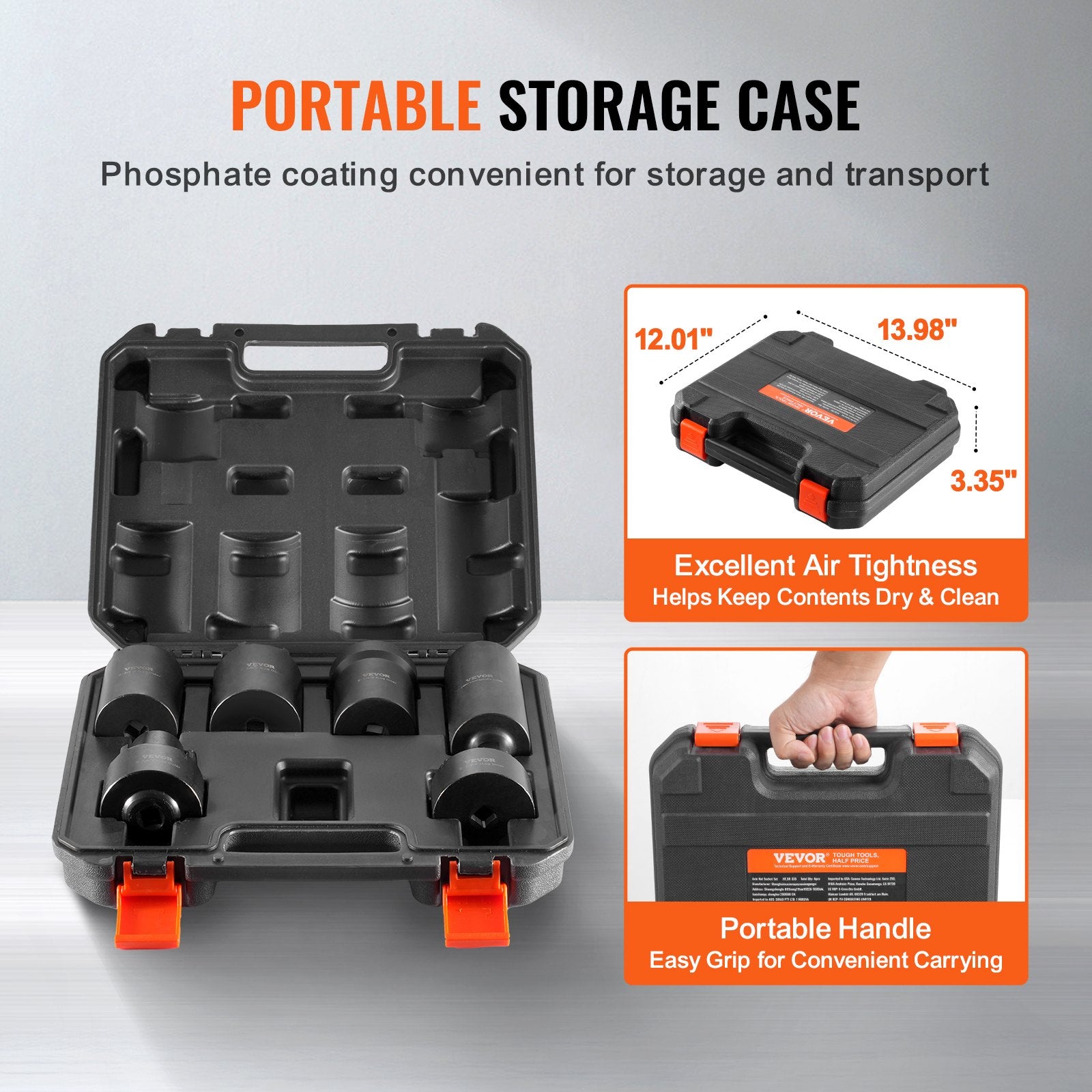 - 1/2-Zoll-Spindelmuttern-Steckschlüsselsatz: Dieser Steckschlüsselsatz enthält sechs verschiedene Größen: 2-3/4" x 4-Loch außen, 2-5/8" x 6-Loch außen, 2-3/8" x 4-Loch außen, 2-1/2" x 4-Loch innen, 2-1/4" x 4-Loch innen sowie einen Vorderachsabzieher für Fahrzeuge mit Frontantrieb. Er ist mit einer Vielzahl von Fahrzeugen kompatibel und ermöglicht das effiziente Lösen von Radnabenmuttern.