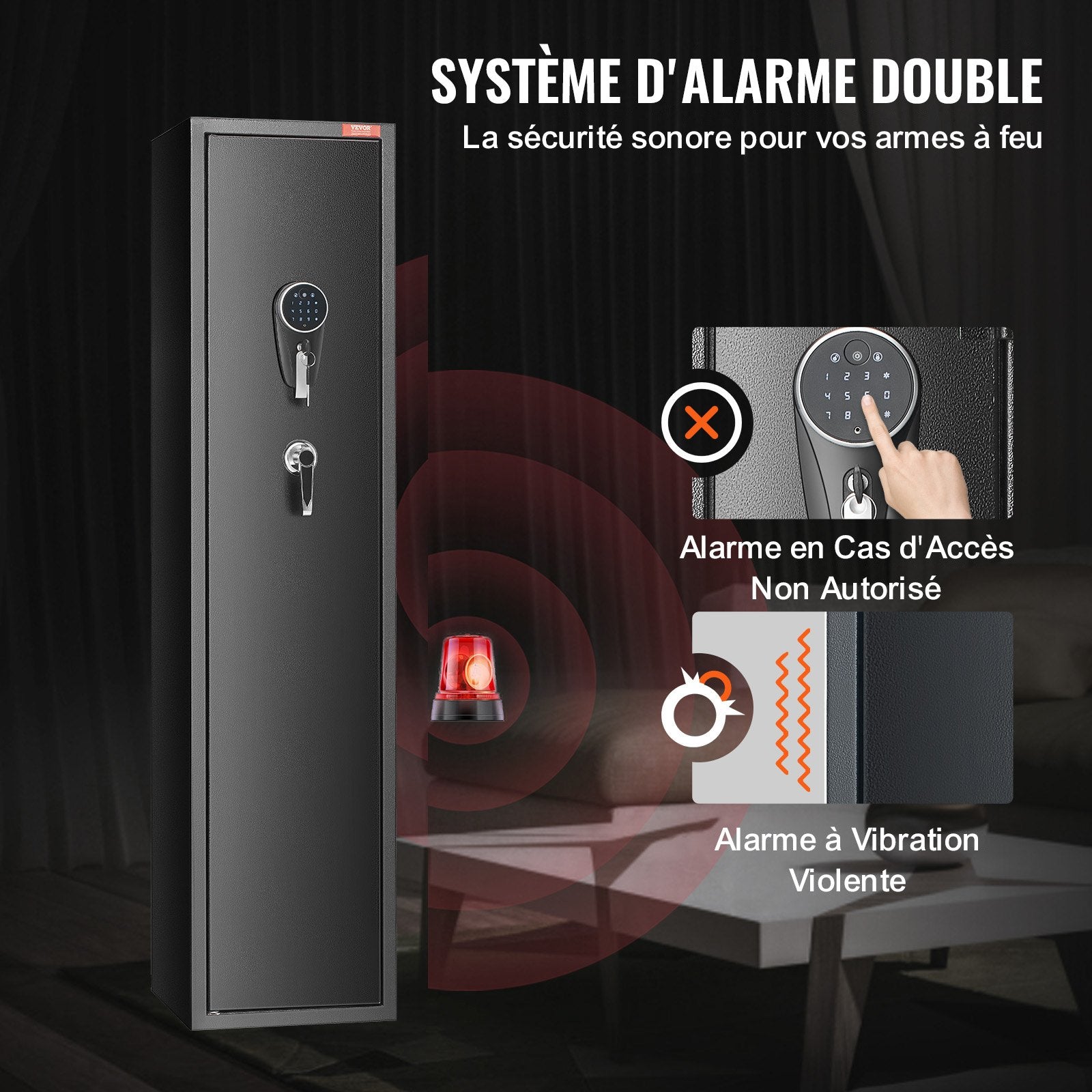 - Alarmsystem & Lautlosmodus: Unser Gewehrschrank verfügt über ein fortschrittliches Alarmsystem, das bei fünfmaliger Falscheingabe des Passworts oder bei einem heftigen Aufprall einen 30-sekündigen Alarm auslöst. Für diskreten Zugriff aktivieren Sie den Lautlosmodus durch Drücken von 11#.