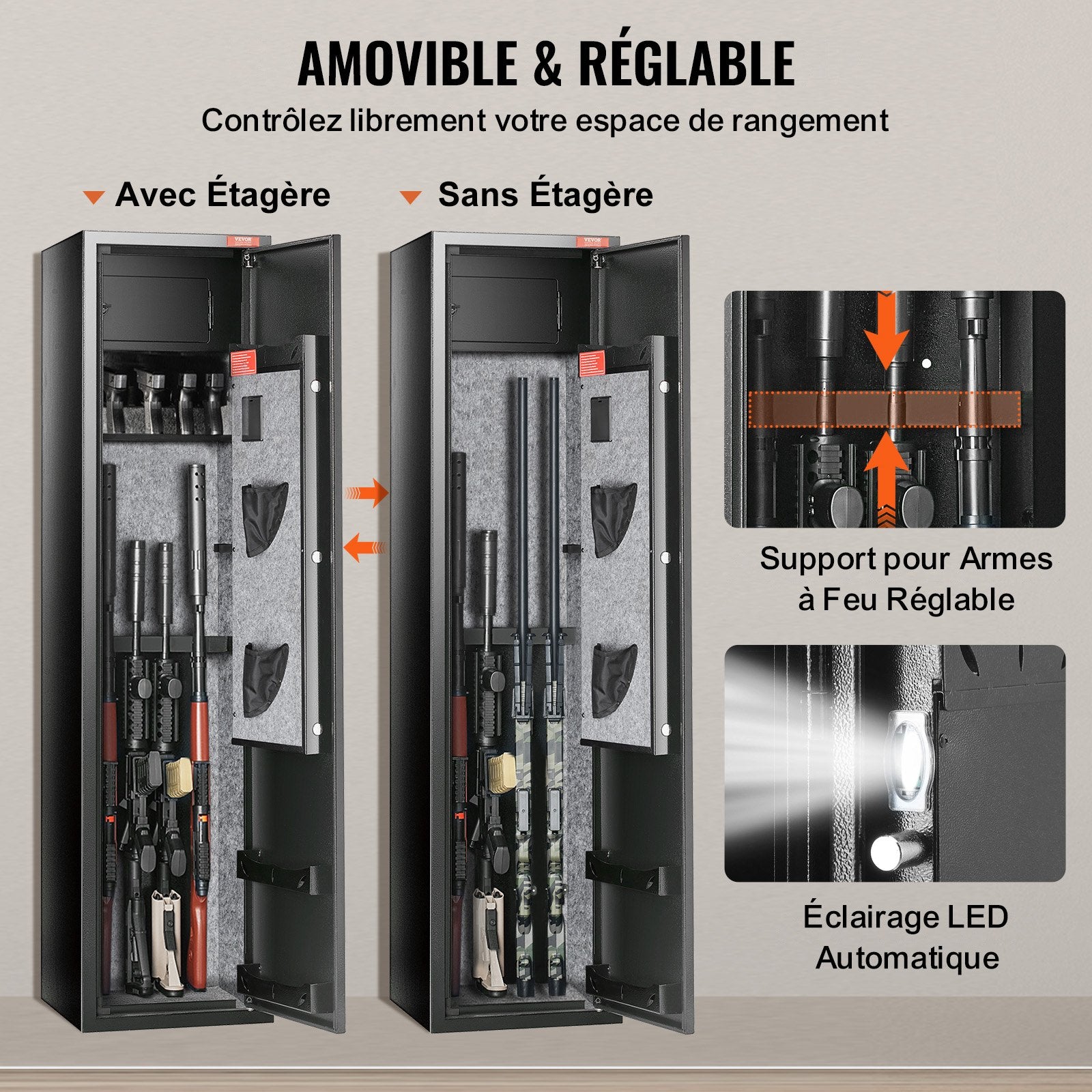- 7-8-Waffen-Tresor mit herausnehmbarem Einlegeboden: Unser Gewehr-Tresor bietet Platz für bis zu fünf Gewehre mit einer Länge von bis zu 122 cm (48 Zoll). Die Langgewehrhalterung ist verstellbar und abnehmbar und sorgt so für noch mehr Flexibilität und Komfort. Der Tresor oben verfügt außerdem über eine Halterung für vier Pistolen und drei Munitionskisten, um Ihre Schusswaffen und Zubehörteile ordentlich aufzubewahren.