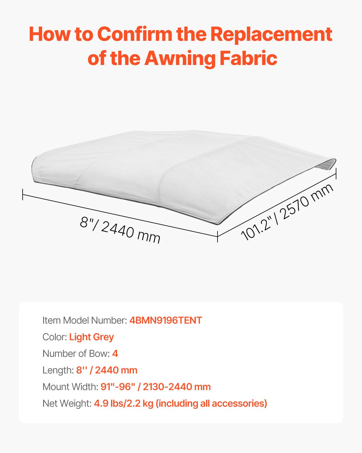 - 4 Bow Replacement Canopy: This boat awning measures 96"Lx(91"-96")W. You can choose the right size based on your boat and canopy dimensions. It can be seamlessly installed on various boat awning frame shapes, ensuring versatility. Note: The aluminum alloy support rods and frame are not included.