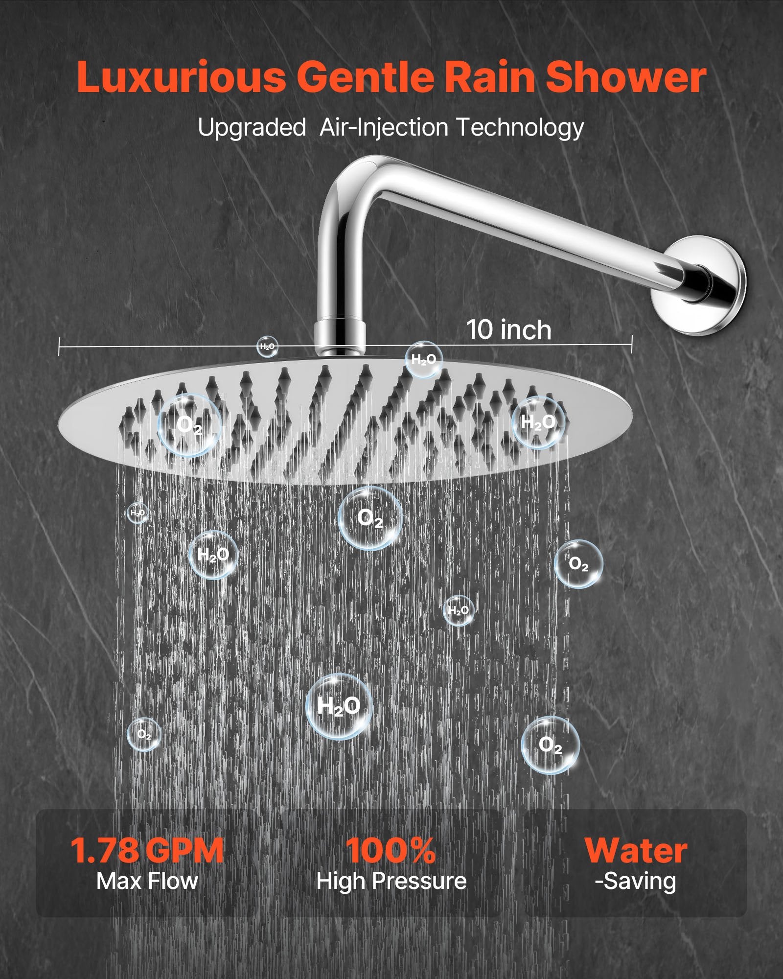 - High-Pressure Shower: Our dual-function shower system provides a luxurious experience with air-injection technology, ensuring high pressure even under low water conditions. Save water with 1.78 GPM flow rate, offering a spa-like, relaxing shower
