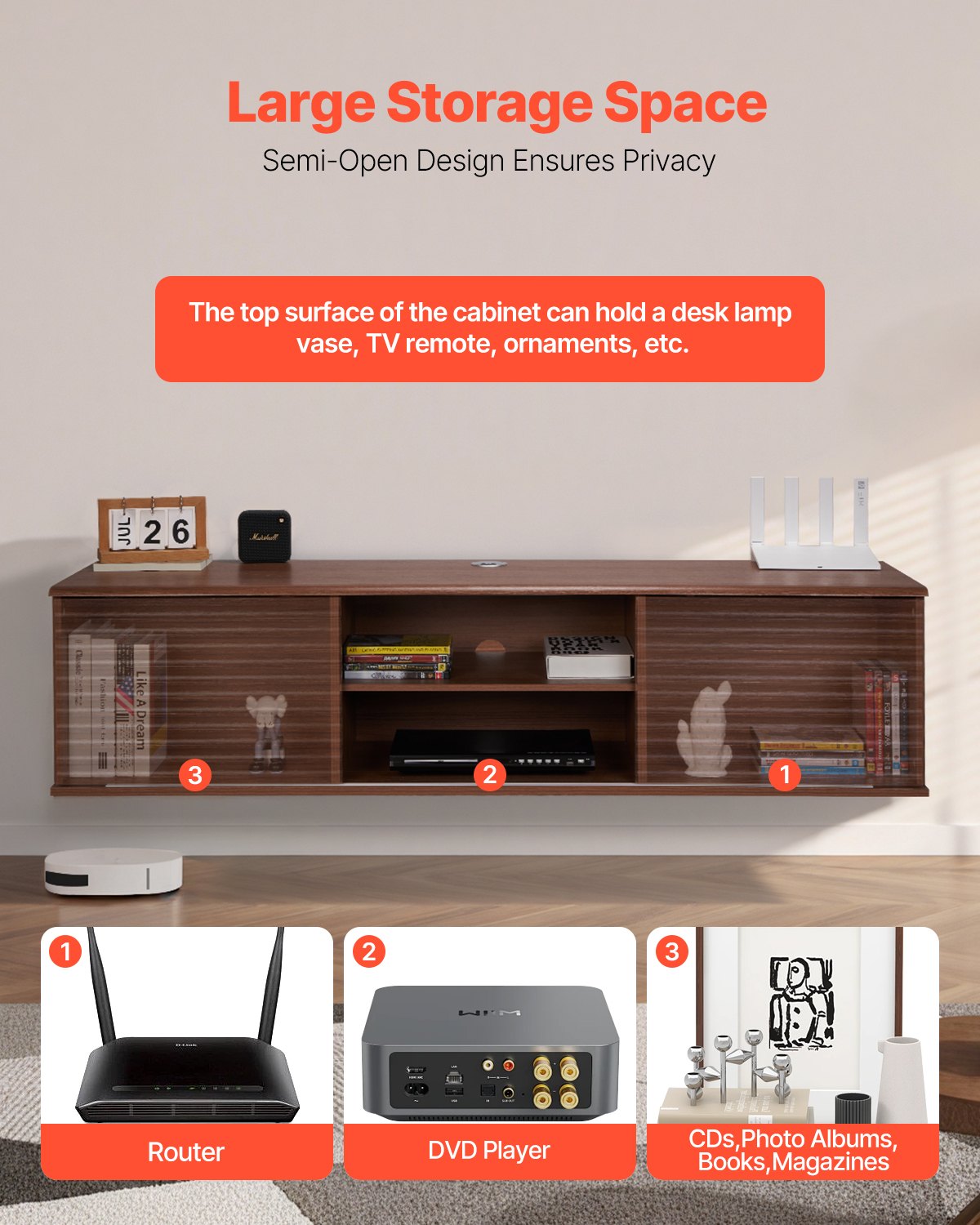 - Ample Storage Space: Keep your living room neat and organized! The wall-mounted design frees up floor space and makes it easy for your robot vacuum to clean. It fits various TV sizes and has a storage cabinet for books and other essentials, plus hidden cable holes to keep things tidy. No more clutter, just a streamlined look!