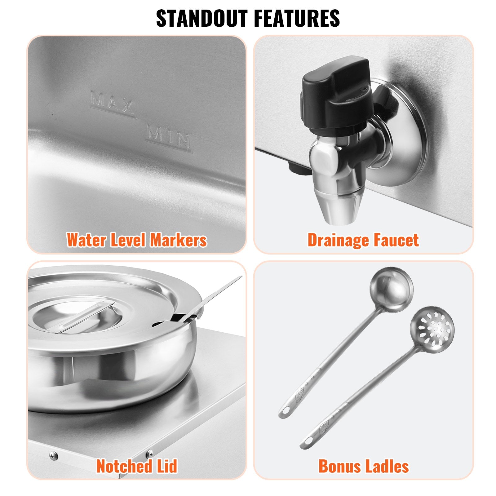 - Details Made for You: The soup pot is thoughtfully designed with water level markers inside for effortless water maintenance. The container features a faucet for draining water after use, reducing the hassle of cleaning the machine’s interior. Additionally, two extra long-handled ladles are included, perfectly suited for deep pots.