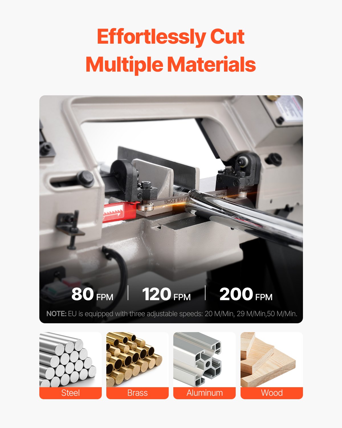 - Versatile Material Compatibility: Equipped with three adjustable speeds—20 m/min, 29 m/min, 50 m/min—this metal cutting band saw adapts to various materials, including steel, aluminum, brass, wood, and plastics. You can adjust the V-belt position on the pulley to match material thickness and type for optimal results