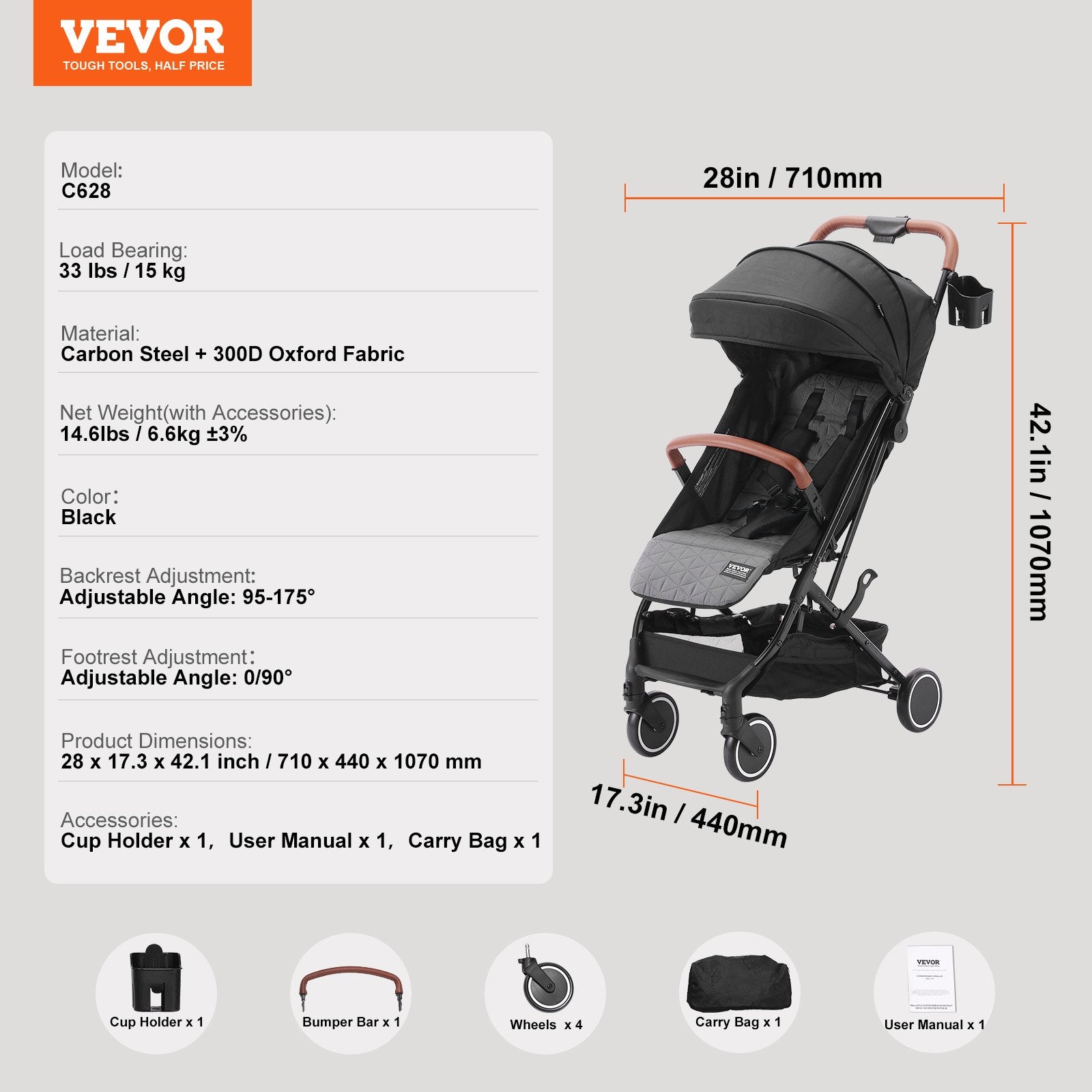 Standard Baby Infant Stroller, Toddler Stroller with 95°-175° Adjustable Backrest & & 0/90°Adjustable Footrest & One-click Folding, Newborn Stroller with Cup Holder and Carry Bag, Black