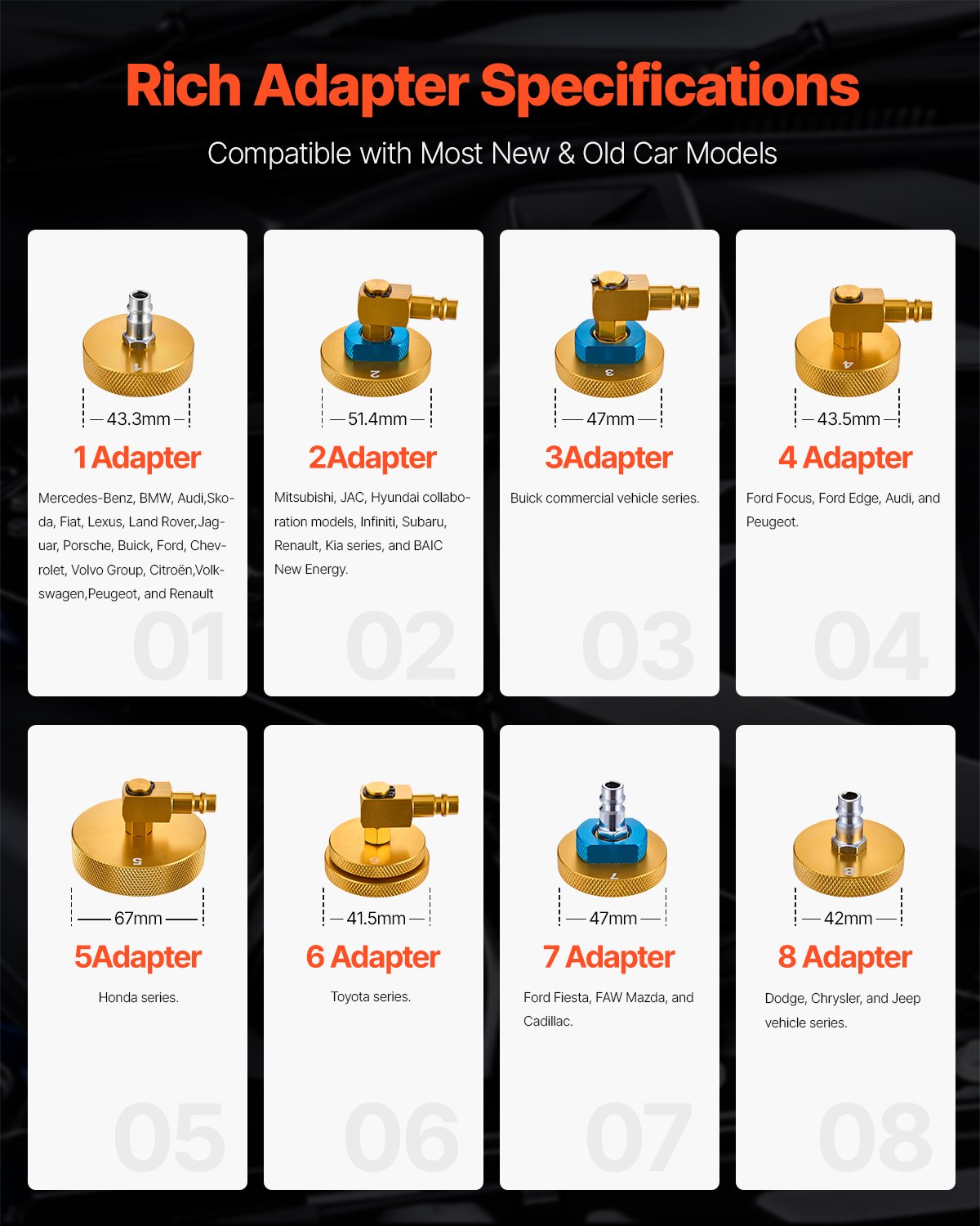 - Product Specifications: The 17-piece brake fluid replacement adapter set includes round adapters and quick connectors in various sizes. It is compatible with a wide range of vehicles, such as Mercedes-Benz, BMW, Audi, Tesla, Lexus, Land Rover, Jaguar, Porsche, and more.