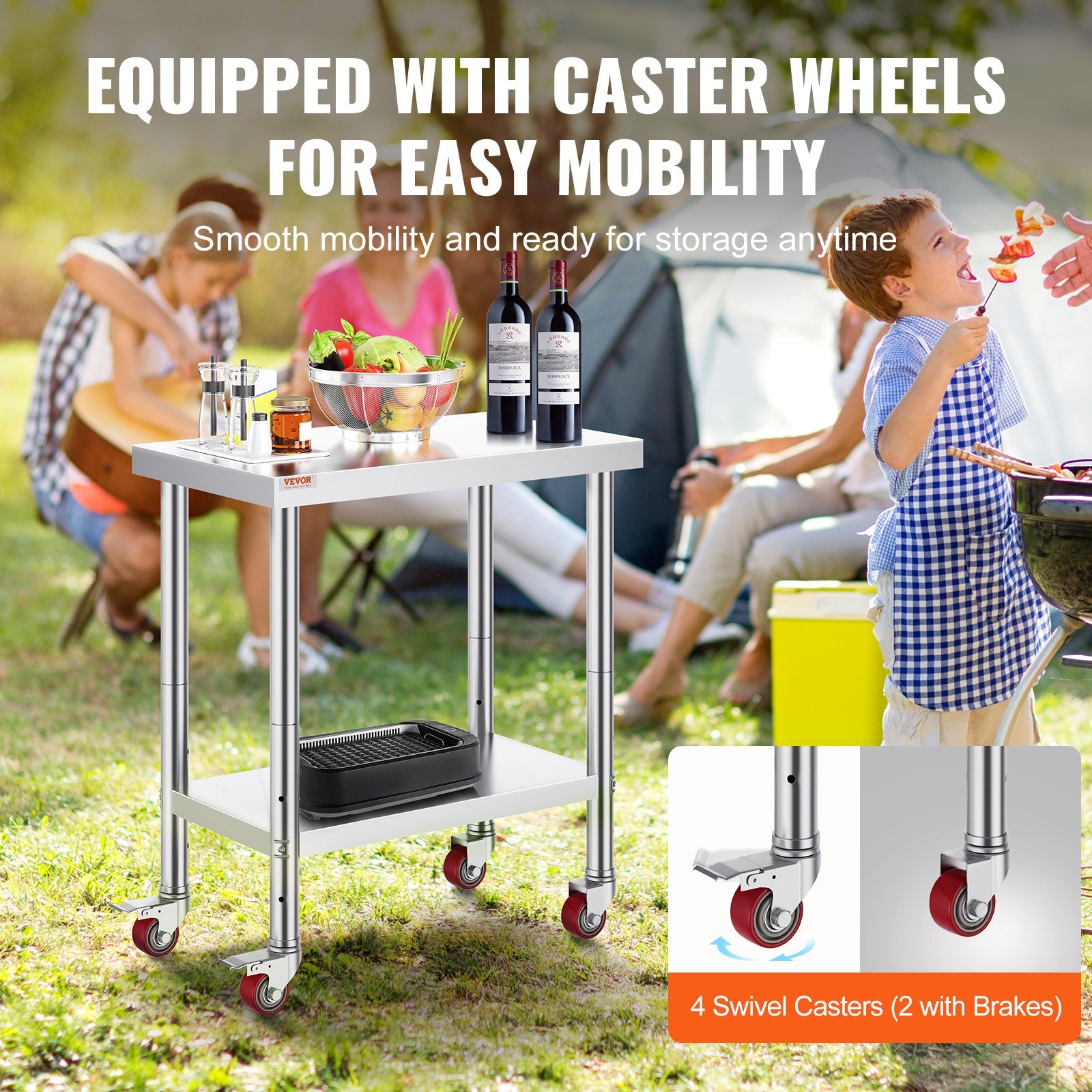 Stainless Steel Catering Work Table 30x18 Inch Commercial Kitchen Table with 4 Wheels Commercial Food Prep Workbench With Flexible Adjustment Shelf for Kitchen Prep Table