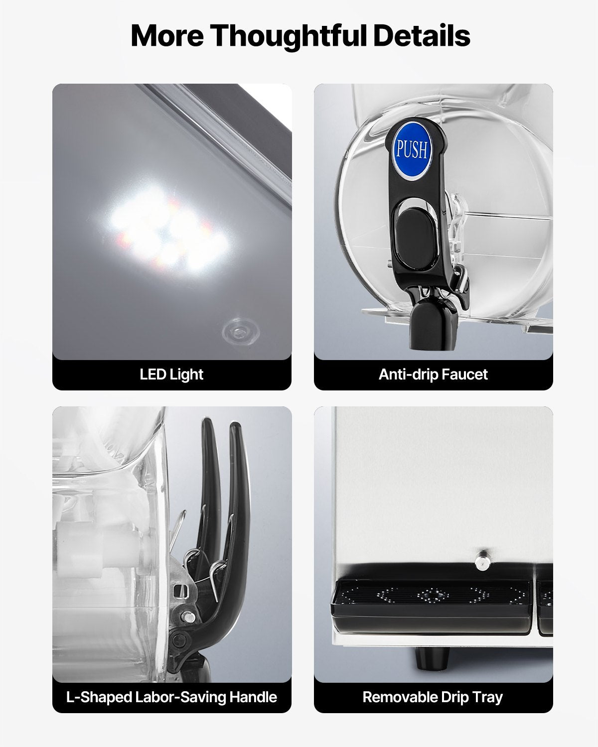 - Additional Features: The slushy maker machine is equipped with a drip tray at the bottom to prevent water leakage, which can be removed for easy cleaning. The spring-loaded faucet ensures minimal water leakage after use. The three-sided ventilation design helps with quick heat dissipation, and the rubber feet provide non-slip stability during operation, ensuring better machine stability.