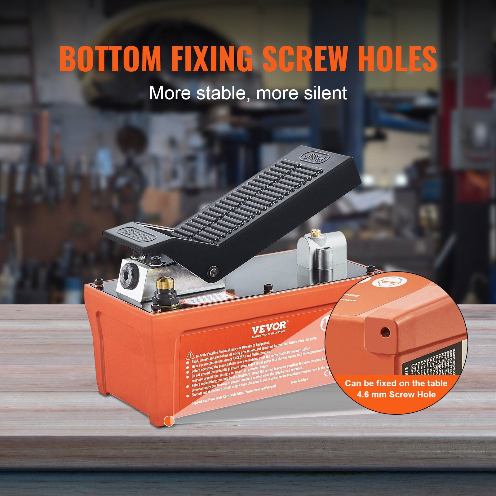 - Non-slip and Shock-proof: With two fixing screw holes located at the bottom, the foot actuated hydraulic pump can be securely positioned, minimizing sliding and vibration during operation. This results in a quieter working environment, providing you with a more comfortable experience.