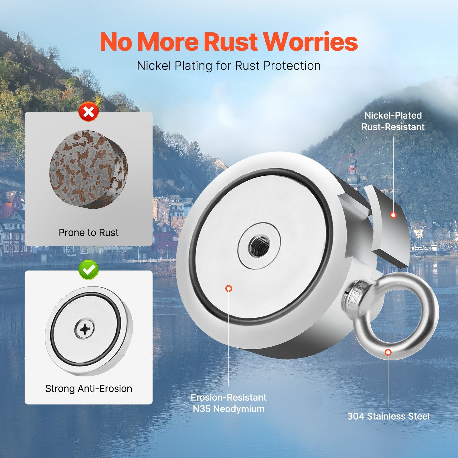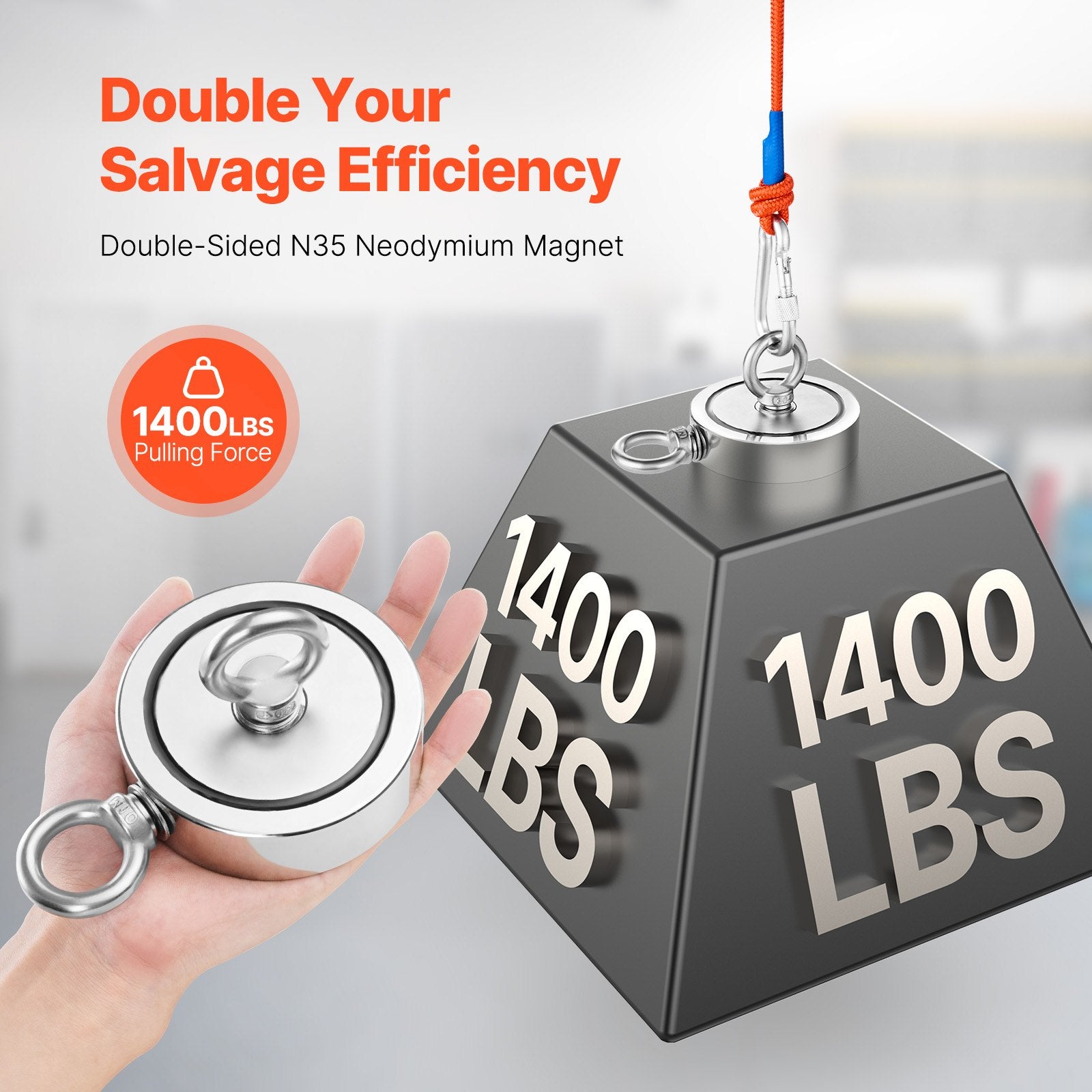 - Double-Sided Strong Magnet: Crafted with premium N35 neodymium material, the dual-sided fishing magnet design greatly improves functionality, providing a maximum pulling force of up to 1400 LBS / 771 kg. You can easily retrieve dropped keys or underwater treasures.