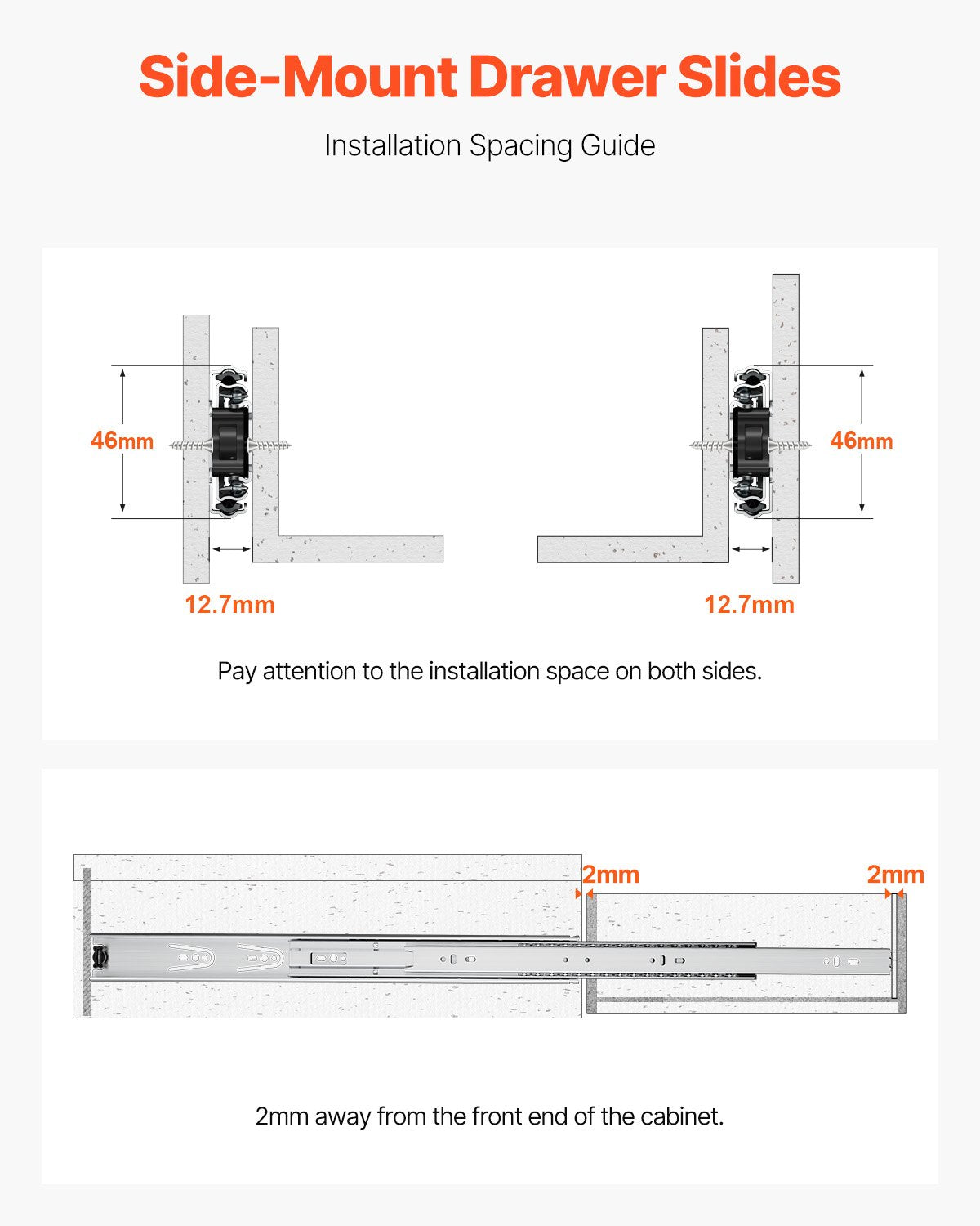 - Installation Guide: Our side-mount drawer rails are designed to address common installation challenges. The specially designed installation spacing guide ensures a 2mm distance from the front of the cabinet, making the installation process easier and preventing unnecessary hassles