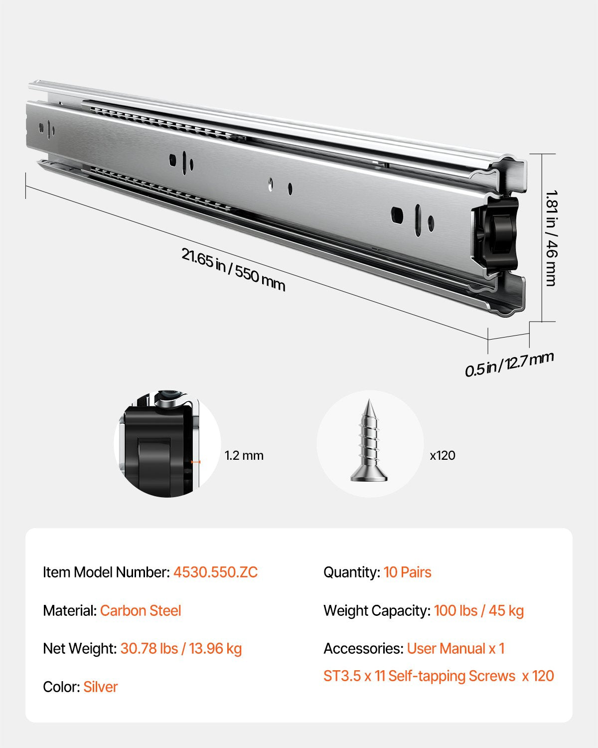 Drawer Slides, 22 inch, 10 Pairs Full Extension Ball Bearing Cabinet Rails, 100 LB Load Capacity Heavy Duty Side Mount Dresser Drawer Slides, Drawer Track Runners for Kitchen DIY Replacement