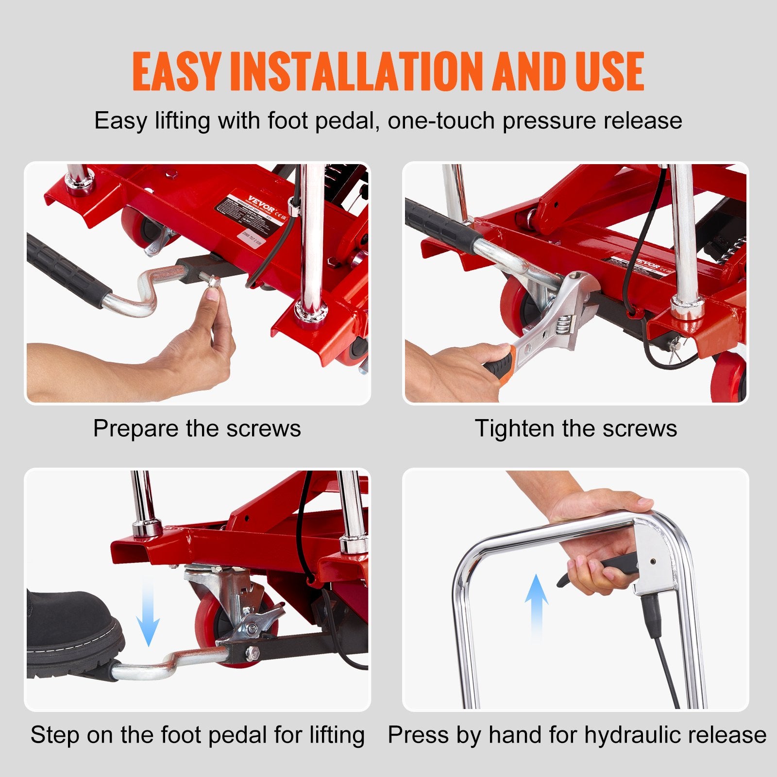 - Effortless Lifting: Say goodbye to heavy-lifting struggles! Our single scissor lift table features a wide foot pedal design, allowing easy and smooth pumping. Lowering is made simple with the convenient hydraulic release lever, giving you full control over the hydraulic pressure.