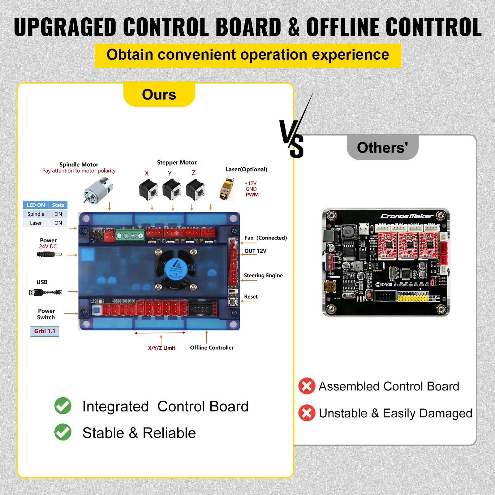 - Upgraded Control Board: The integrated GRBL control features full functionality and stability. And the advantages of the offline controller lies in the following ones: 1. No need to connect to the computer; 2. Arbitrary selection of offline files for engraving. 3. Manually adjust the X, Y, and Z axes position as the engraving starting point, manually turn on or off the spindle.4. High precision: less than 0.003 inches.