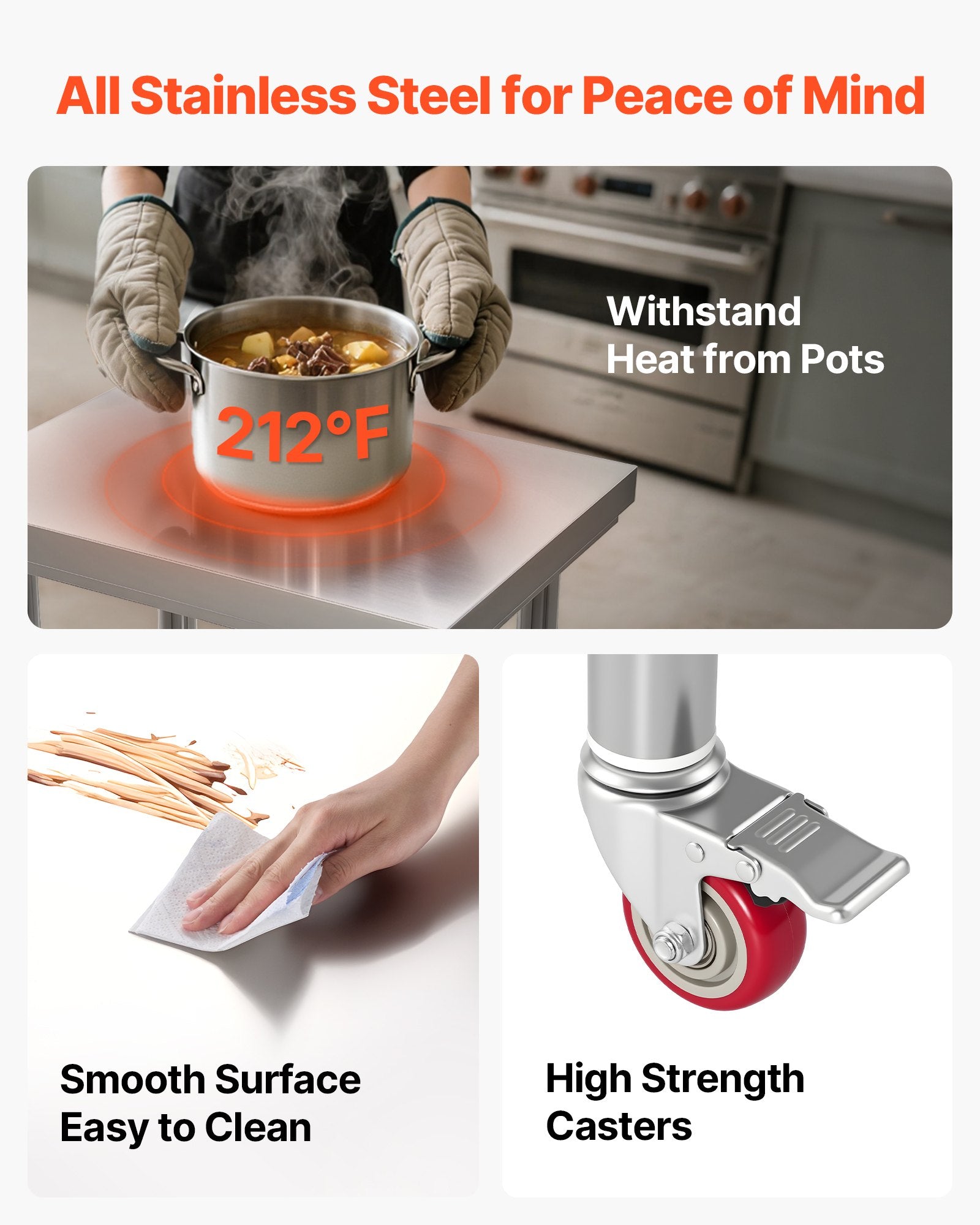 - Stable and Durable: The top shelf holds up to 400 lbs, the bottom 300 lbs, providing ample storage for your supplies. With 4 swivel casters (2 with brakes), the food prep worktable stays stable and moves easily wherever you need it