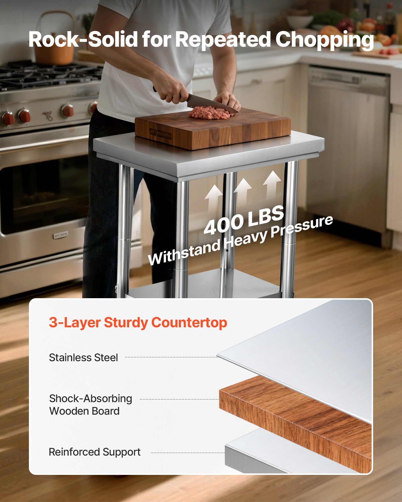 - High-Quality Stainless Steel: Our 24 x 18 x 34 inch stainless steel work table is made from SUS201 stainless steel for the tabletop, shelves, and legs. It resists rust, looks sleek, and cleans easily with a simple wipe