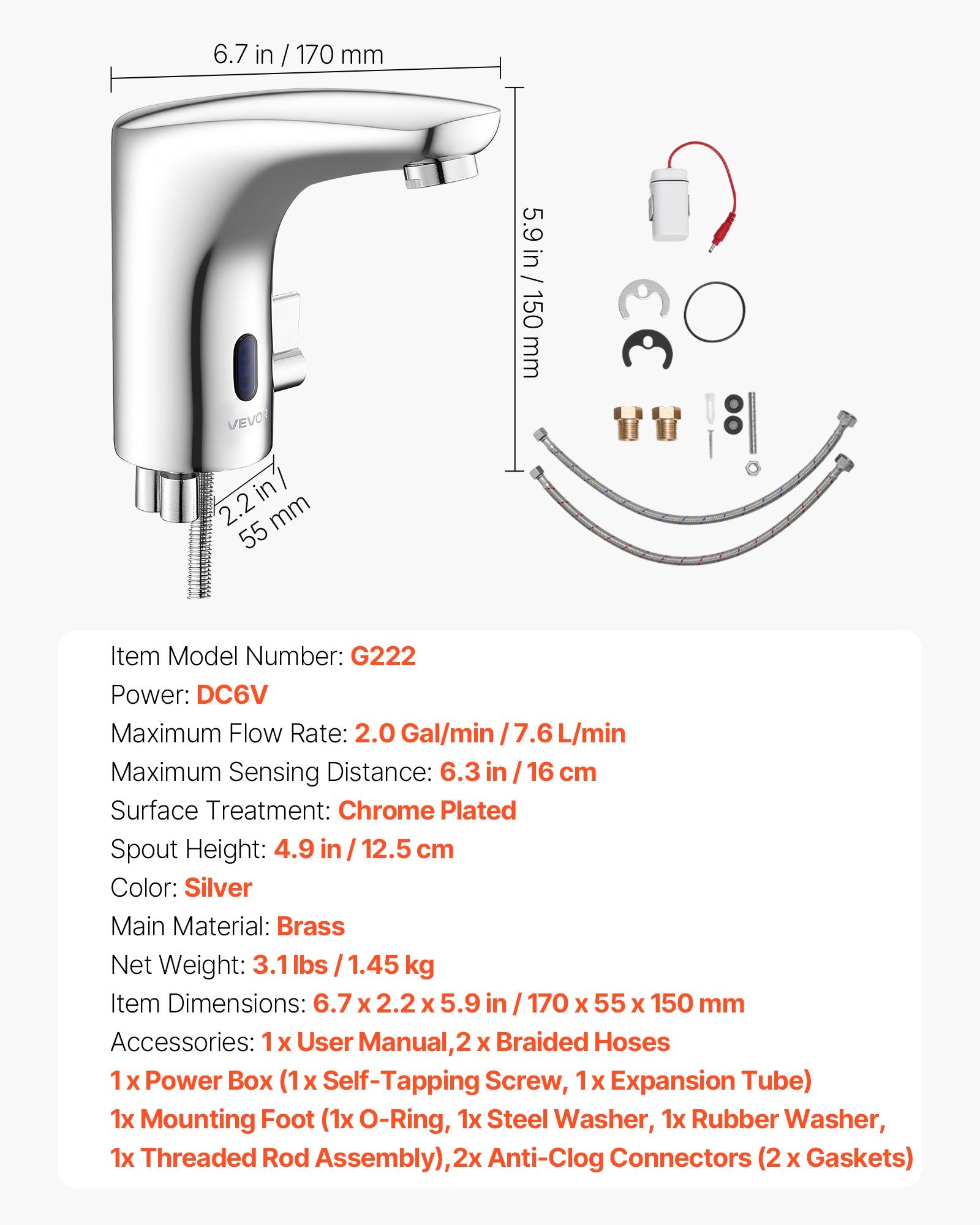 - Hose Length: 23.6 in / 600 mm