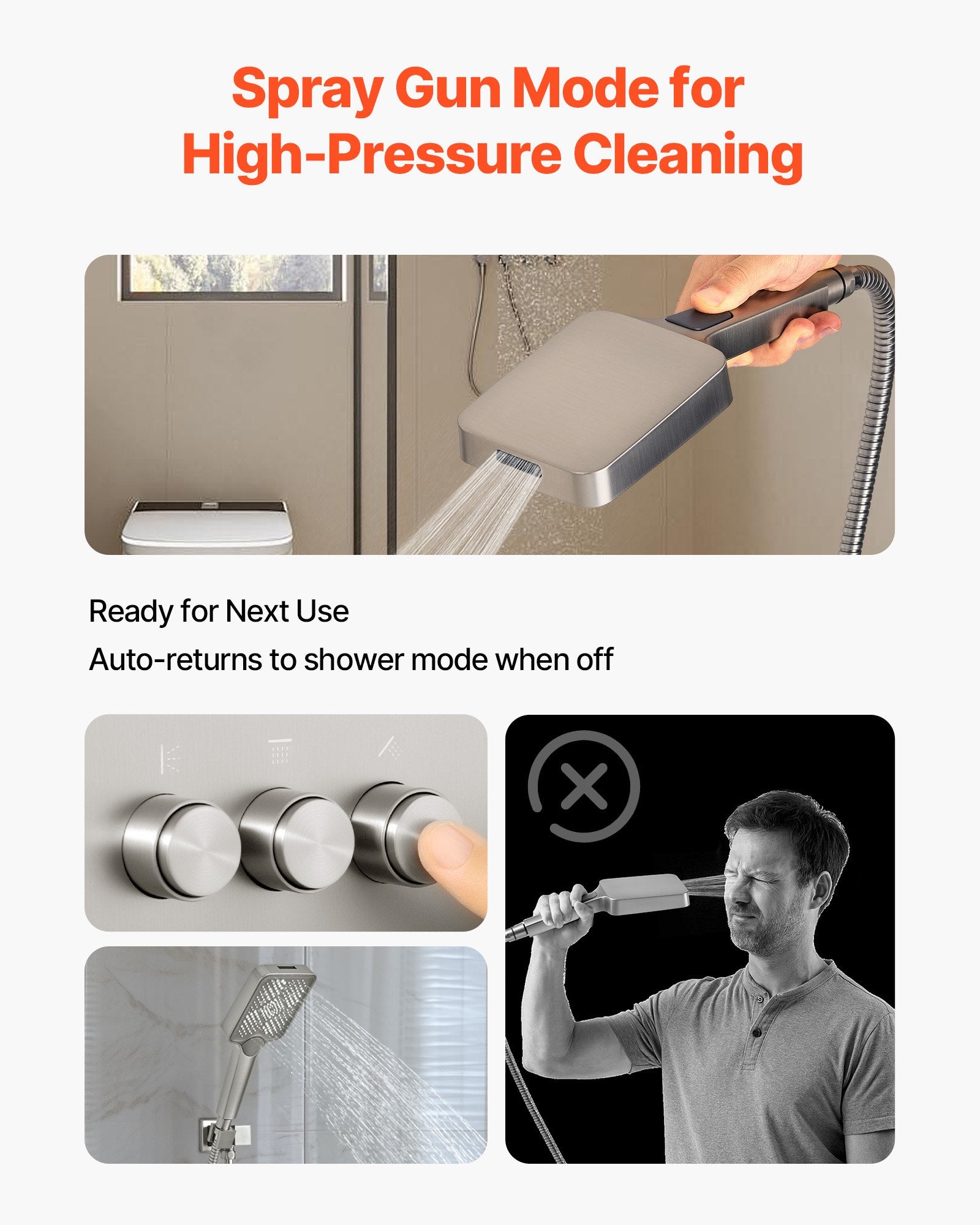 - 4-in-1 Handheld Shower: Part of our shower system, it has three shower modes and a jet spray. The pressurized jet rinses walls & tubs, then auto-returns to shower mode to avoid accidents. A 4.9 ft/1.5 m hose and swivel holder ensure multi-angle cleaning