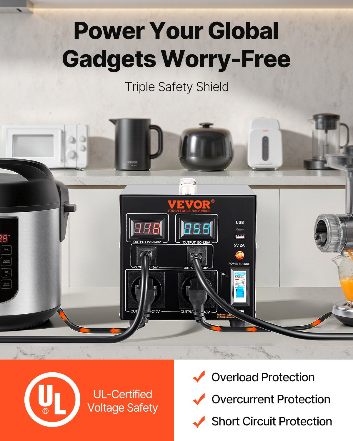- 2000W Voltage Converter Transformer: This step up down transformer features 4 AC plugs, including 2 US NEMA 5-15R 3-Pin output sockets, 2 European Shucko output sockets, 1 5V USB port, and 1 Type-C jack. It is built with 2 LED displays showing the current output voltage in real-time to avoid transformer overload.
