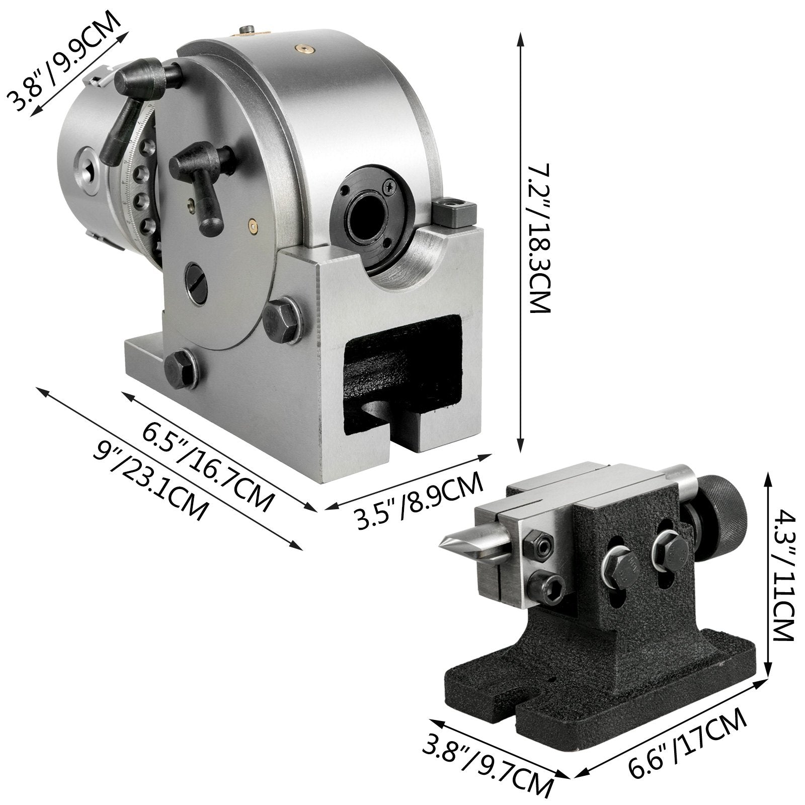 - 【ADJUSTABLE DIVIDING HEAD】- The semi-universal dividing head features 4" 3-jaw chuck, Spindle Hole Diameter: 18mm. The headstock is adjustable from the horizontal position to 90 degrees upward. Center Height: 4"/100mm. Free 3 more jaws for 4" chuck.