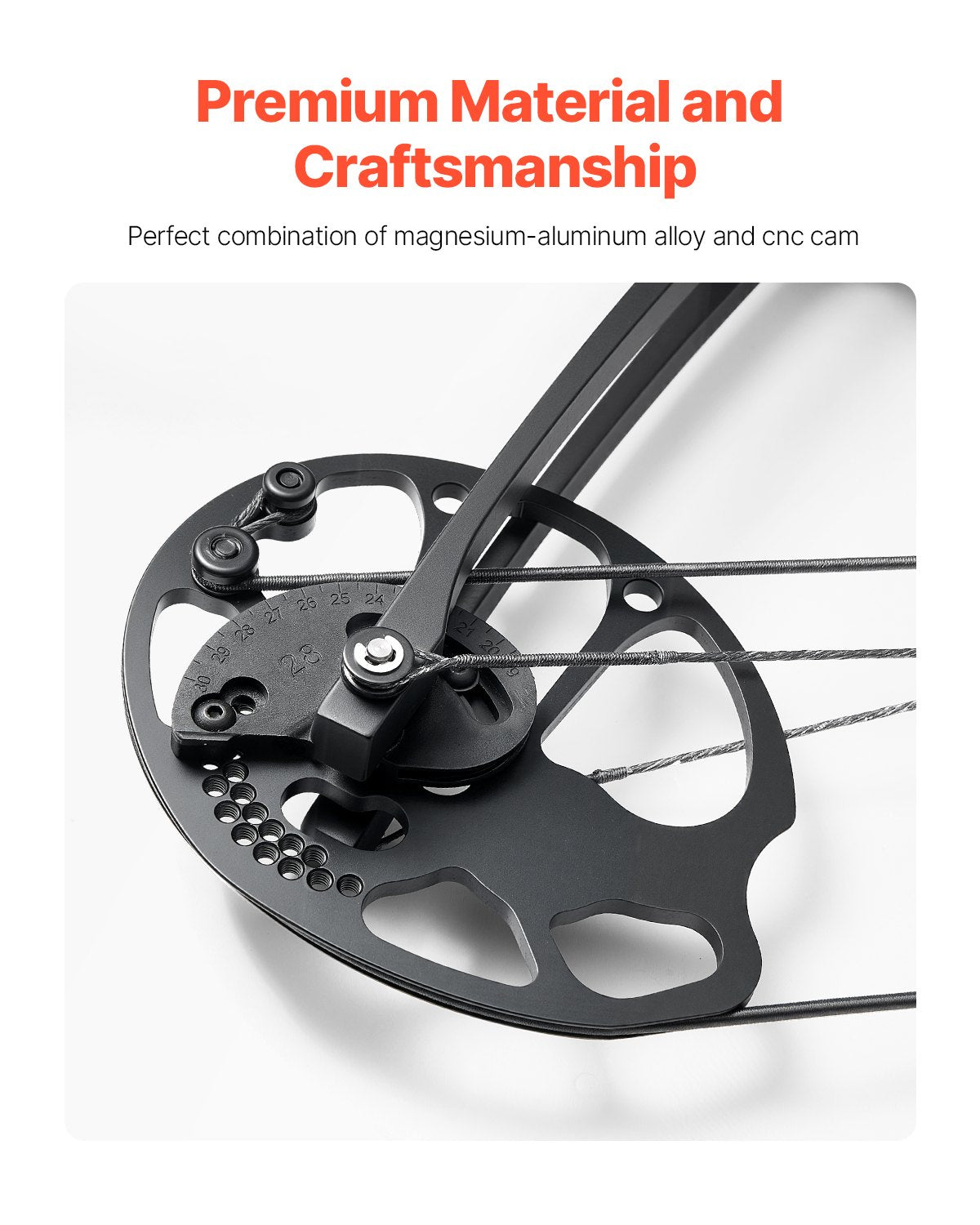 - Premium and Durable Material: The compound bow package is made from a combination of magnesium-aluminum alloy and CNC cam materials, making it strong and resistant to wear. The bow is easy to draw and continues to perform excellently