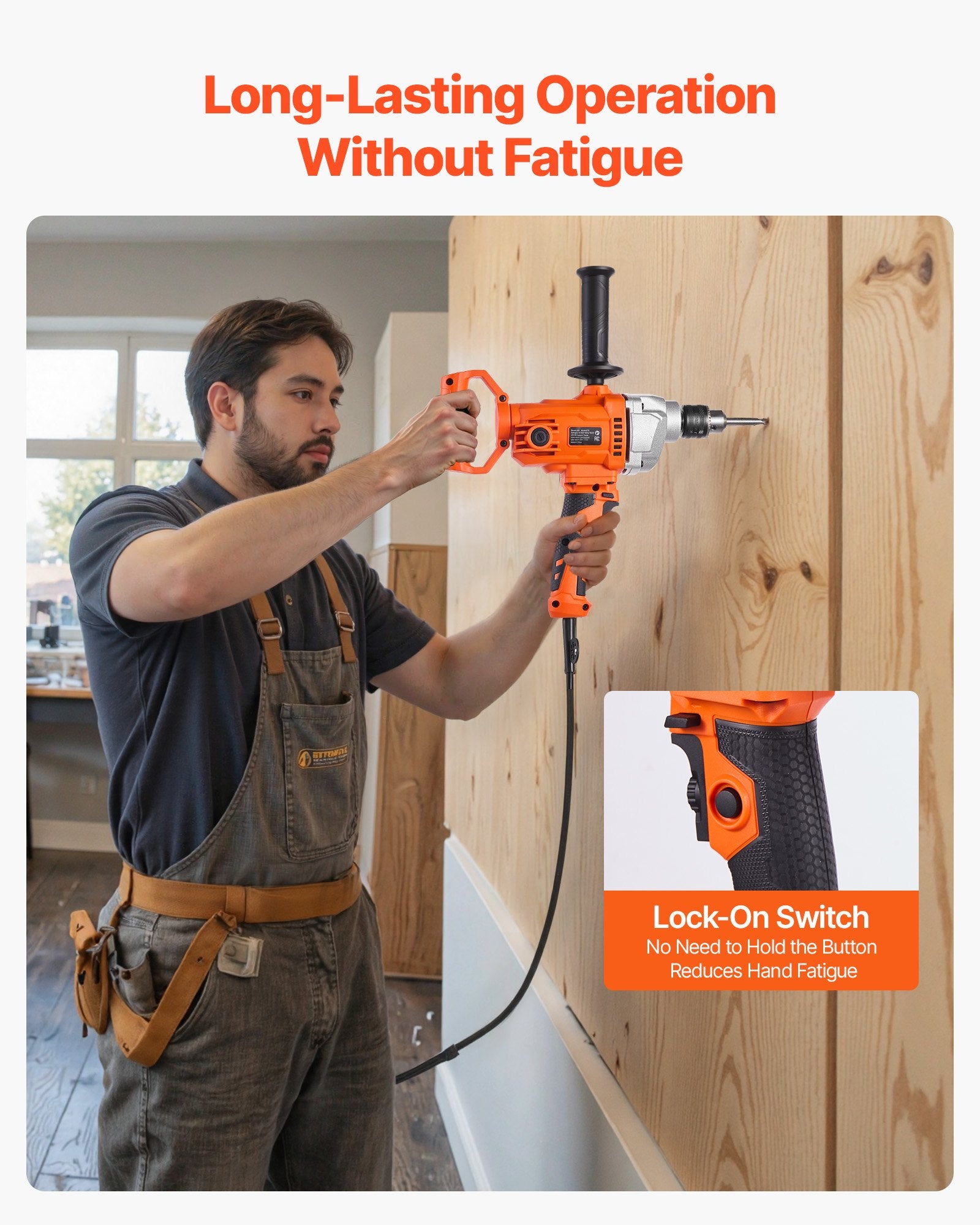 - User-Friendly Details: Built for ease, VEVOR handheld cement mixer includes a rotating rear handle, anti-vibration rubber grip, and a lock-on button. The extra-long 16.4 ft / 5m cord gives you more range to move freely across your workspace