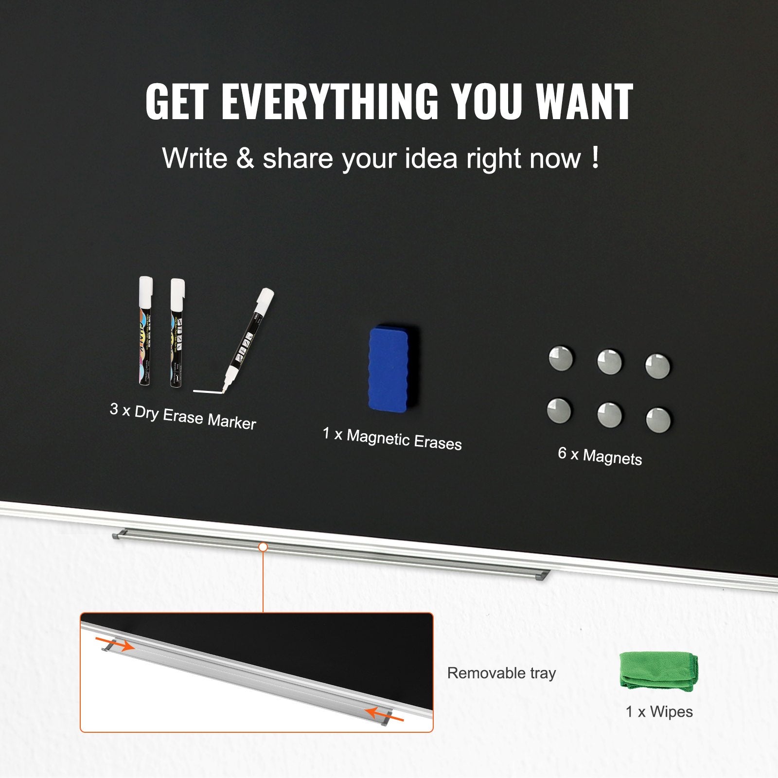 - Complete Set Included: Our wall-mounted blackboard comes with everything you need to start: three markers, one eraser, six magnets, and a movable tray for easy access to writing supplies. You can also use standard dry-erase markers and erasers on our boards. Write down your thoughts and ideas, and share them with others instantly!