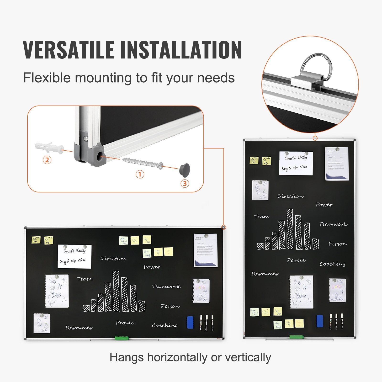 - Versatile Installation: VEVOR's blackboard offers flexible installation options, allowing you to set it up horizontally or vertically to suit any space. Enjoy unmatched creativity and productivity with this versatile tool.