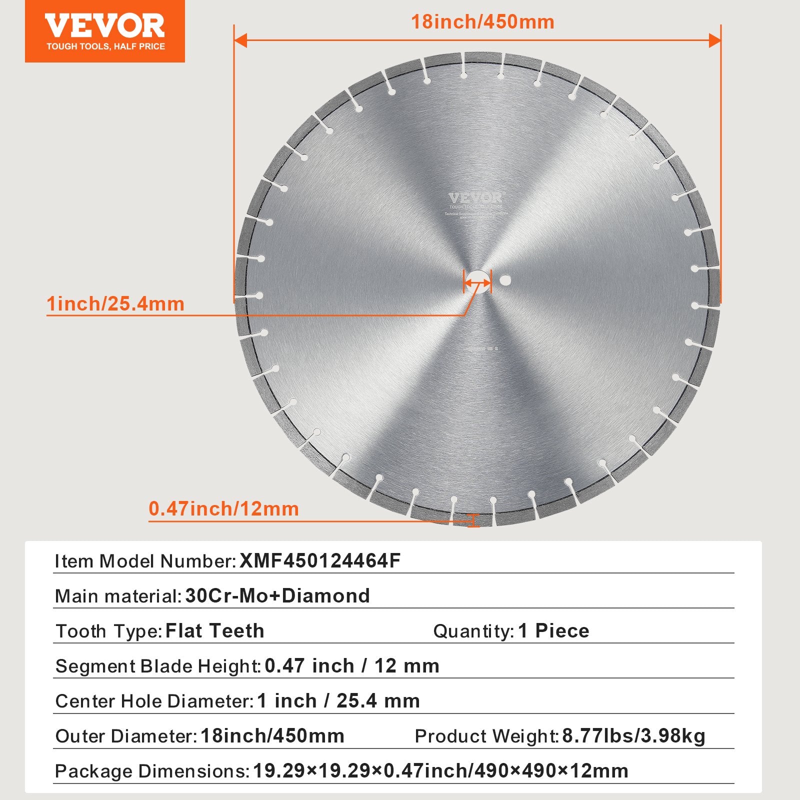 Diamond Blade, 18inch/450mm Concrete Saw Blade Wet or Dry, 0.47inch/12mm Flat Teeth Diamond Segment Blade, Universal 1 inch/25.4 mm Center Hole Diameter, for Concrete Cement Board Tile Brick