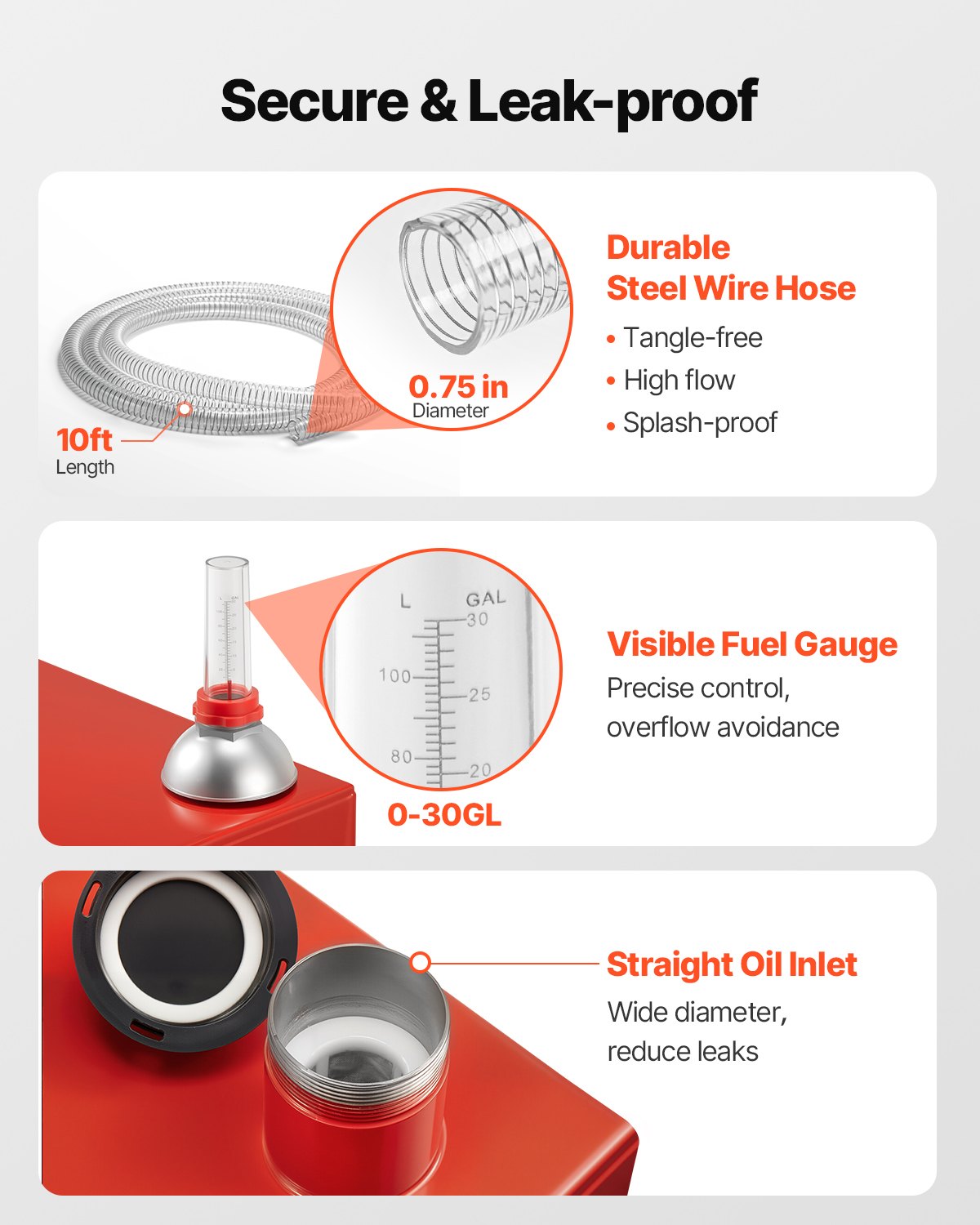 - Security Design: Designed with security in mind, this fuel storage tank features a kink-resistant steel hose, smooth fuel flow, and a visible fuel gauge. The wide inlet helps avoid spills, while leak-proof features ensure a clean and secure refueling process every time.