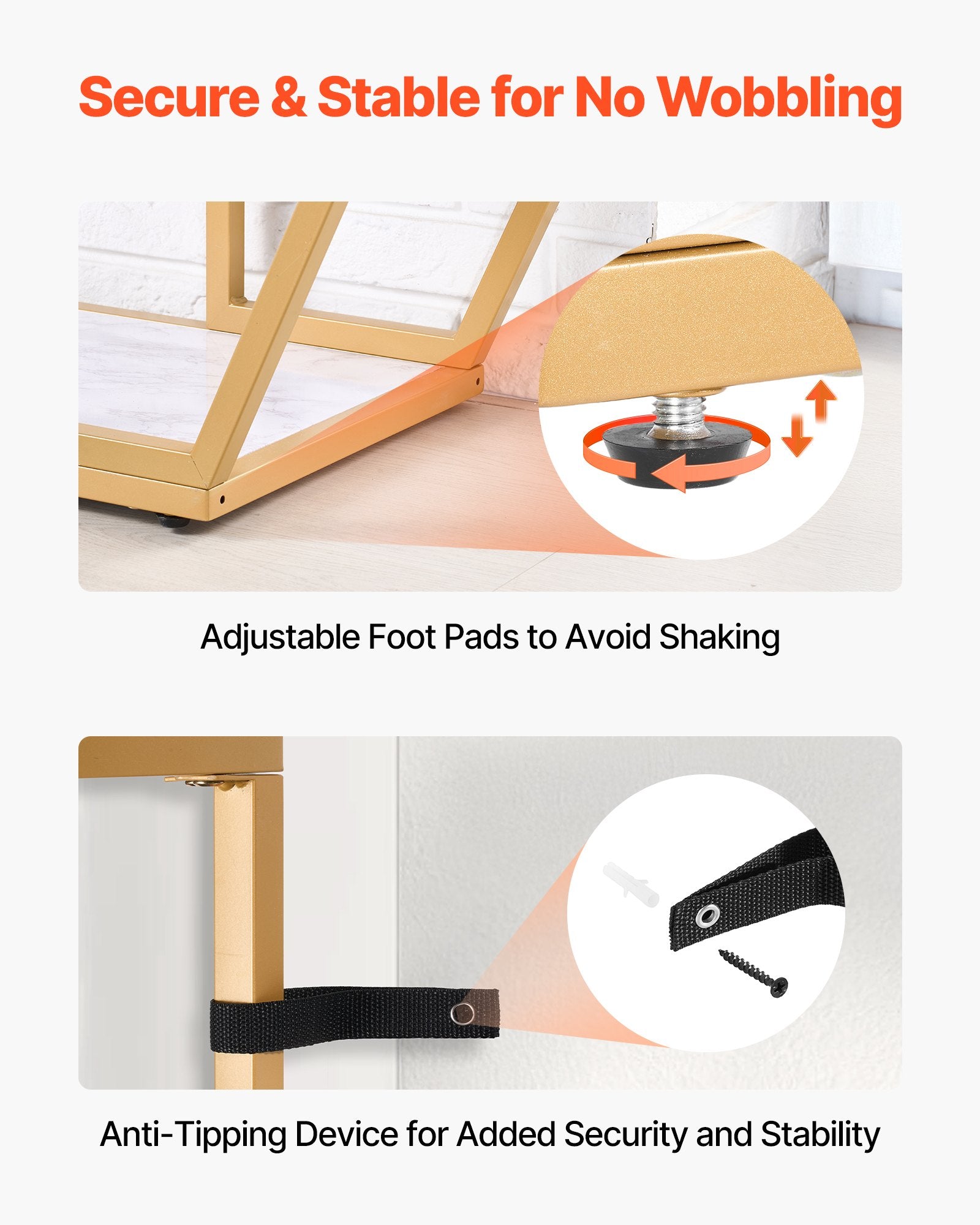 - Thoughtful Details: Adjustable foot pads adapt to uneven floors, ensuring the table stays steady and preventing wobbling, while also protecting your floors from scratches. The anti-tip device adds extra security—be sure to install it for enhanced stability.