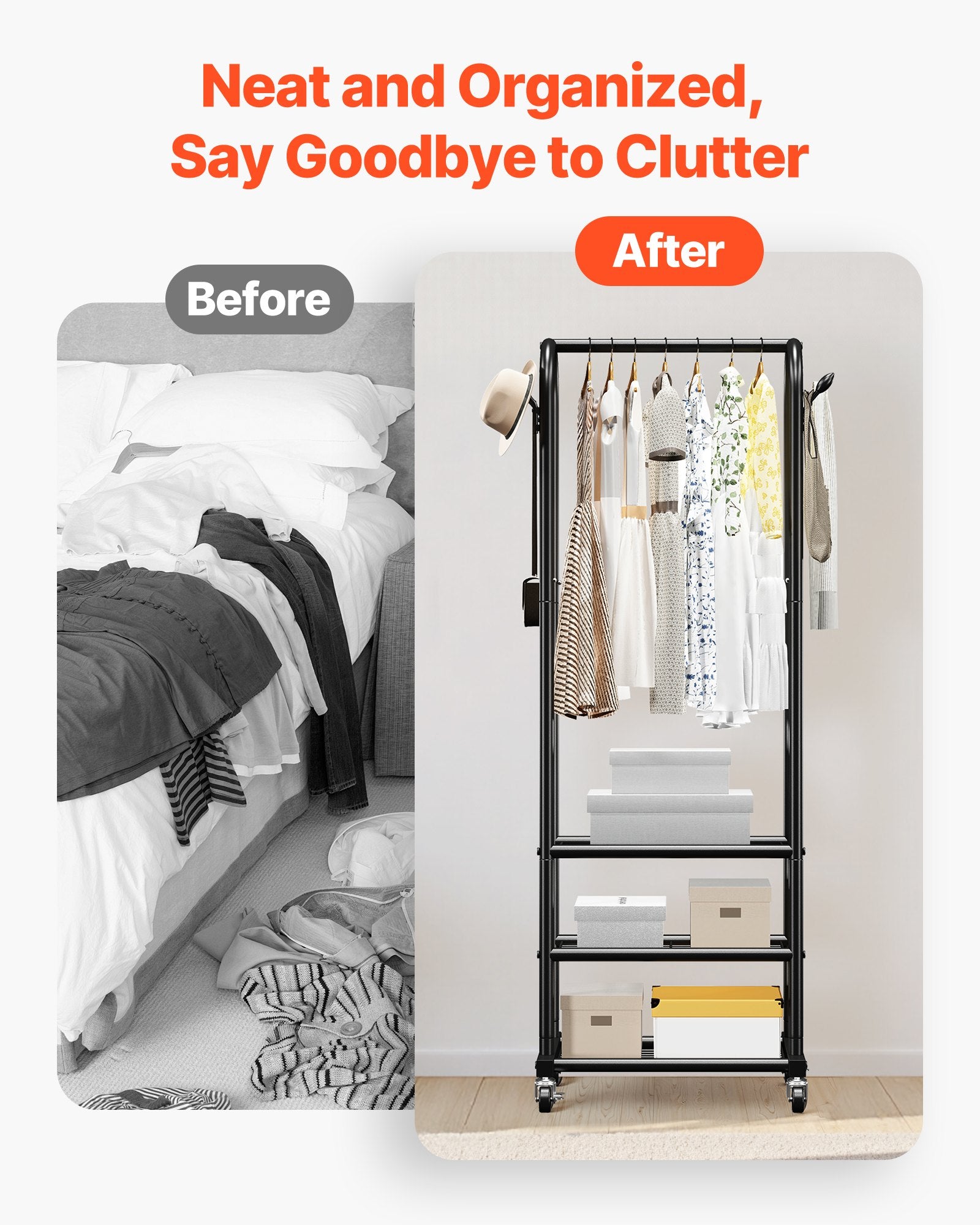 - Flexible Mobility: The rolling clothes rack comes with 4 smooth 360° swivel wheels, 2 with locks to keep it in place. Rubber casters roll quietly and protect floors from scratches, ensuring stability and safety while moving or standing still