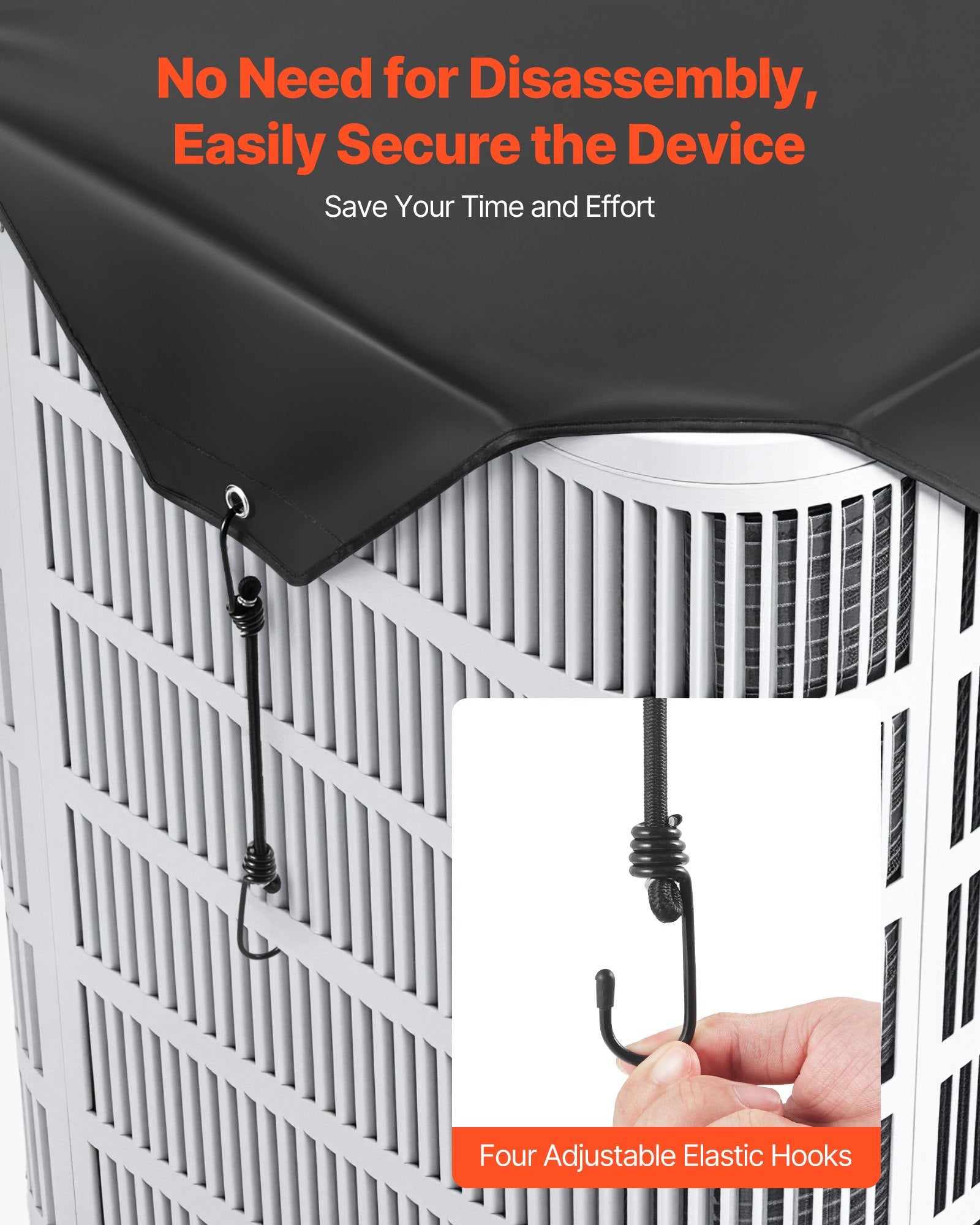 - Easy Installation: The air conditioner cover features four adjustable elastic hooks, allowing easy attachment without moving the unit. The hooks adjust to fit the device size,ensuring a secure fit. Simple and quick installation saves time and effort