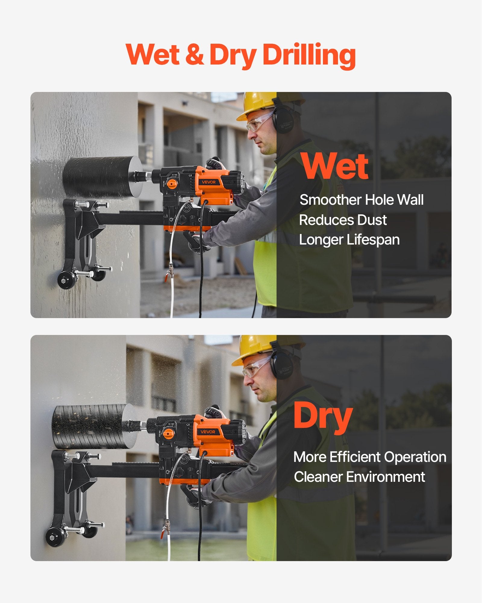 - Superior Hole Quality: Our diamond core drilling machine features both wet and dry drilling. The wet drilling option flushes out debris and cools the bit with water, reducing dust and improving hole smoothness—great for indoor renovation work