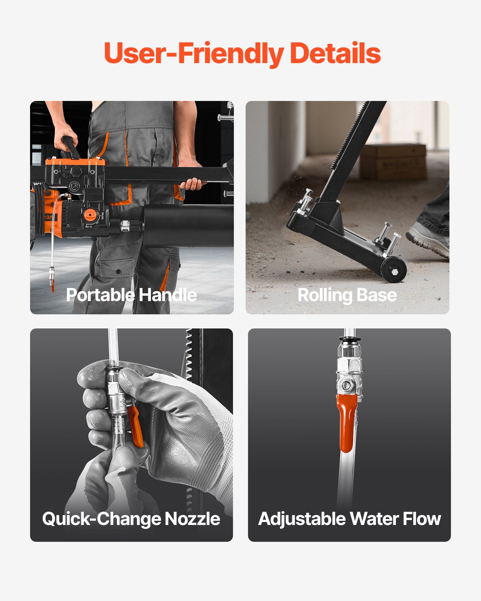 - Built to Last: Crafted with a lightweight yet tough aluminum body, this core drill rig resists wear and tear. It has wheels for easier transport. The PVC water hose is crack-resistant, and the steel output shaft delivers consistent accuracy