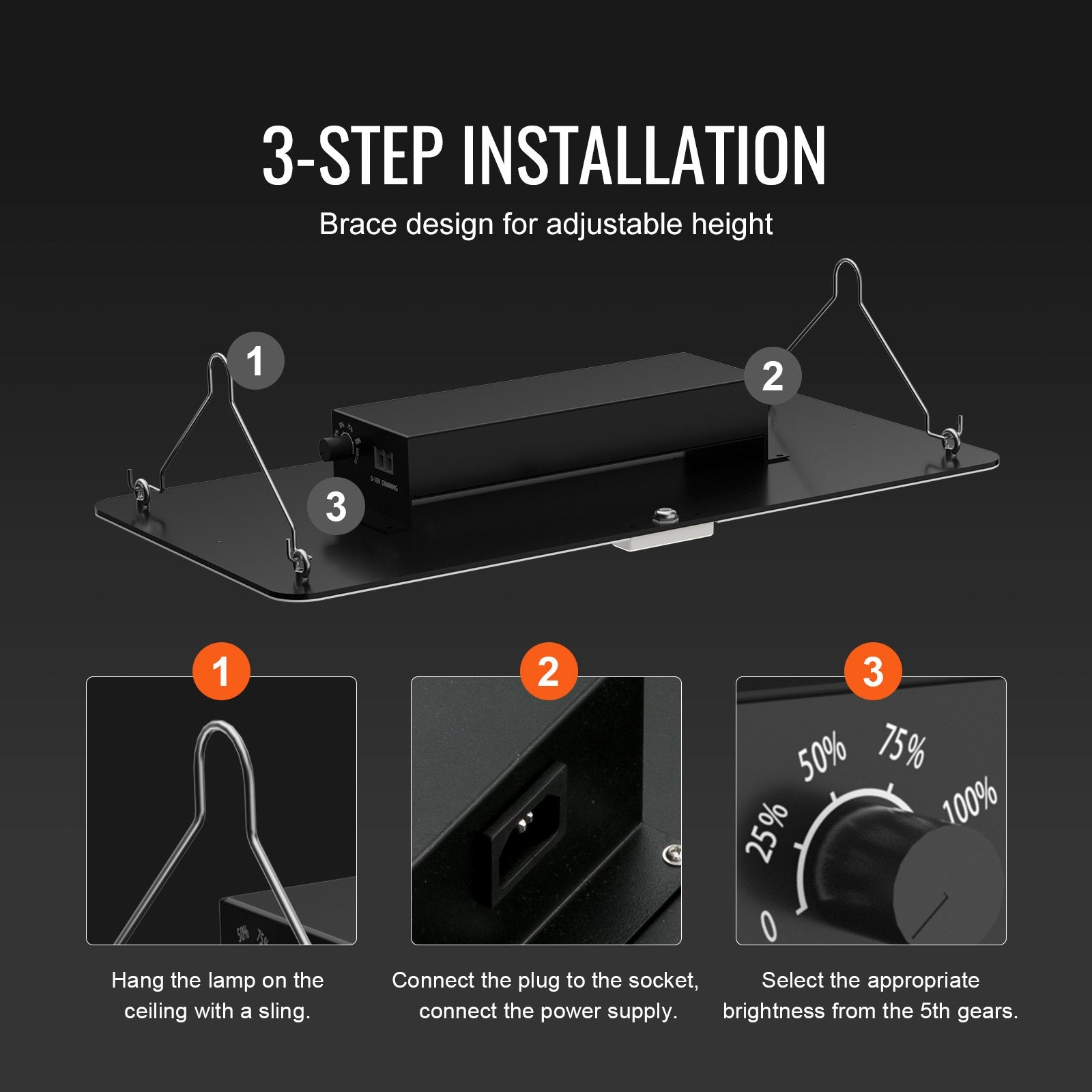 - Hassle-free to Install & Adjust: Our growing light is designed with a stay bar, and the height can be adjusted at will, making it stable and flexible to install. With five brightness gears, you can adjust the light intensity freely. The multi-light connection with unified dimming is especially beneficial for large indoor growing and commercial planting, allowing you to take control of any space.