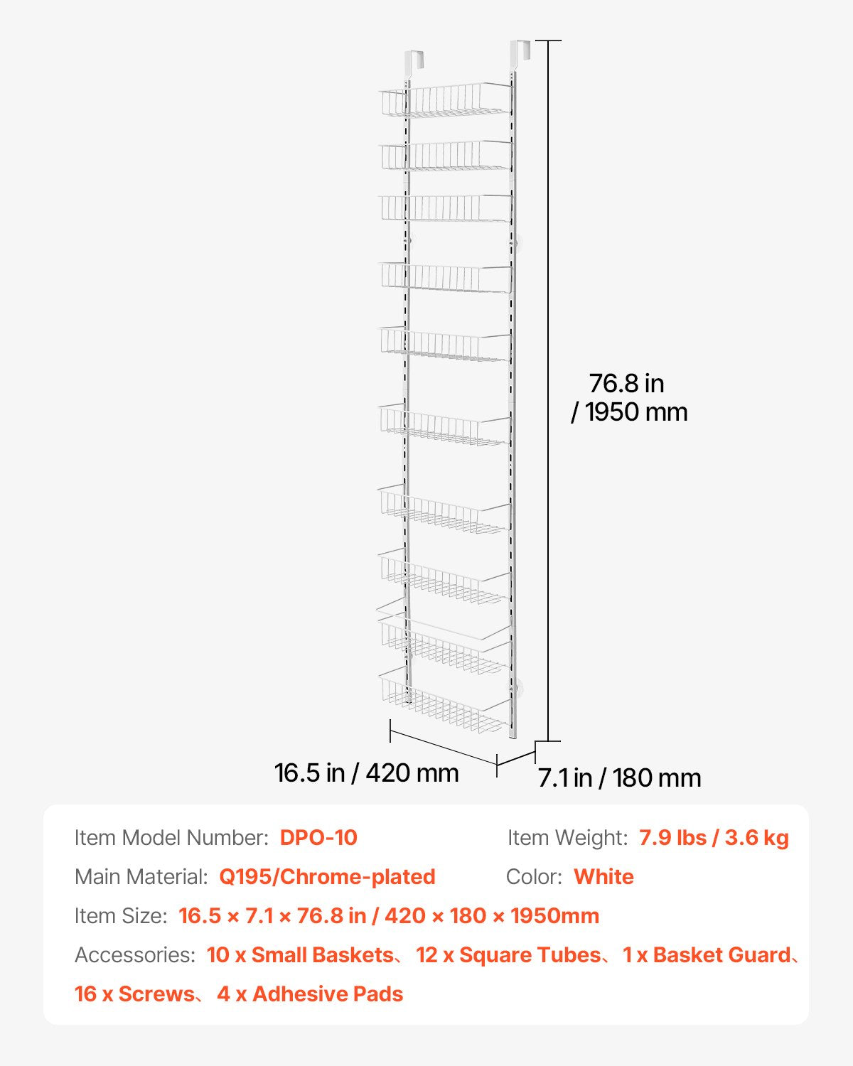 Over the Door Pantry Organizer, 10-Tier Pantry Organization and Storage, Heavy-Duty Steel Hanging Spice Rack, Adjustable Wall Seasoning Shelves, for Home Kitchen Laundry Room Bathroom, White