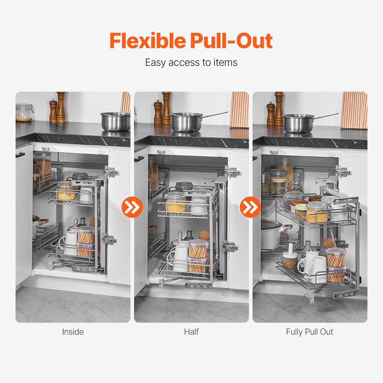 - Cabinet Blind Spot Storage: The blind corner pull out organizer features a clever design that addresses kitchen corner blind spots, transforming hard-to-reach deep spaces into efficient storage areas and preventing wasted space.