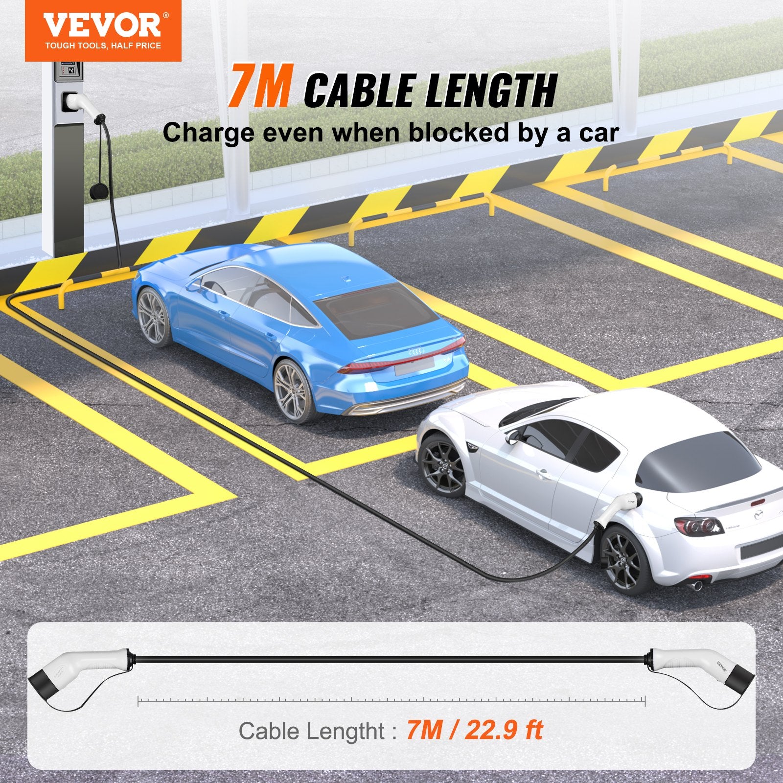 - Reach Further than Ever: Are you tired of going to charge stations to charge your car? Get ready to charge up when you want. The 22.9 feet/7 m long EV charging cable allows you to charge your car at home or at public charging points at will, adapting to the charging port position of all models.