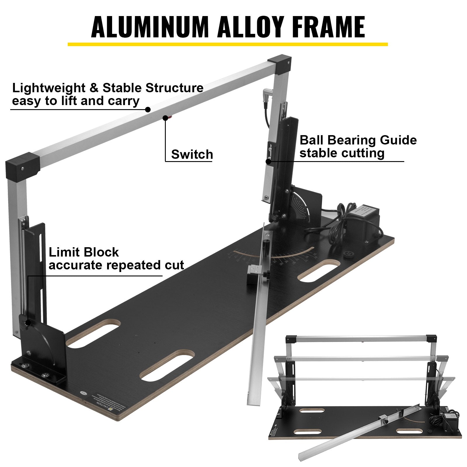 - Aluminum Movable Frame: The movable aluminum frame makes the foam cutter machine lightweight for convenient lifting and carrying on the construction site. Thanks to the ball-bearing guide, the cutting bar slides smoothly through the styrofoam plate. Also, the pre-assembled stop tabs & the depth limiter enable the stable operation and exact repeat cuts.