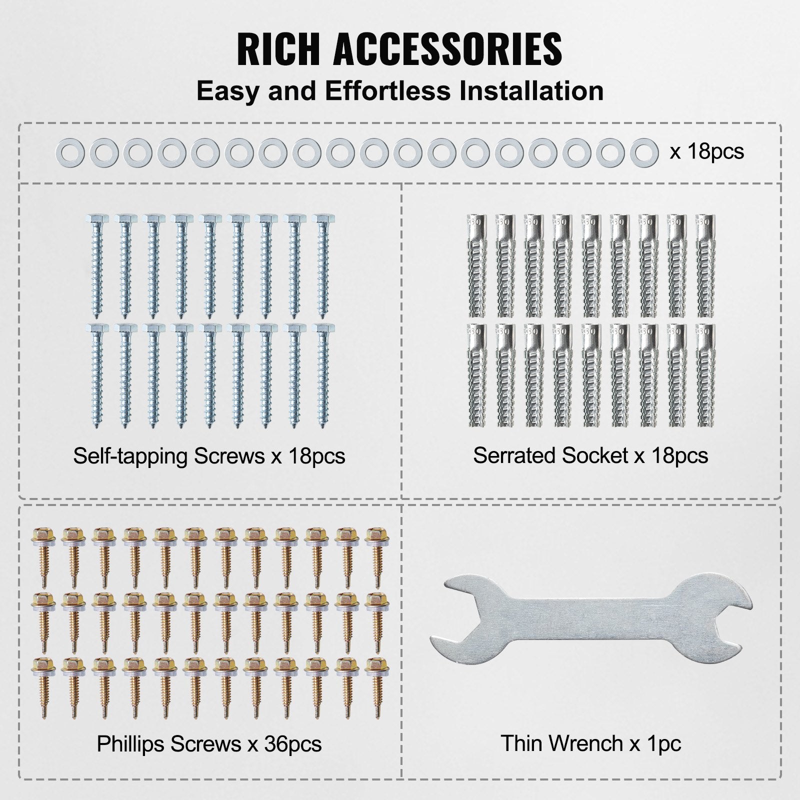 - Complete Set Of Accessories: The kit includes a complete set of accessories: Dovetail Screws M525 (36pcs), Thin Wrench M8 Open-End 14 (1pc), Serrated Sleeves M8 (18pcs), Self-Tapping Screws M860 (18pcs). Installation is straightforward and hassle-free.